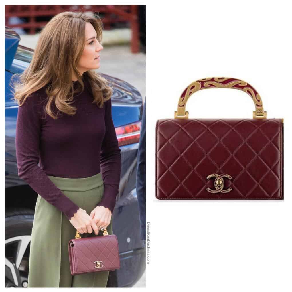 كانت هذه الحقيبة المبطّنة باللون البورغوندي قطعة ملكية مفضّلة للأميرة في مناسبات عدة. حملت حقيبة "شانيل" ذات المقبض المزخرف في آذار (مارس) 2017 في باريس، وبعد عام حملت الحقيبة الصغيرة من مجموعة خريف/شتاء 2015 لحضور قداس الأحد في ساندرينغهام عام 2018. كما نسّقت الحقيبة مع بنطال واسع وسترة صوفية بلون التوت من "ويرهاوس" في تشرين الأول (أكتوبر) 2019 لزيارة متحف، ونسّقت معها بدلة بنطال عنابي اللون في رحلة إلى بوسطن في كانون الأول/ديسمبر 2022. تُحب الأميرة حمل حقيبة "شانيل آرت نوفيل" الصغيرة ذات الغطاء في نزهات الخريف والجولات الملكية. على الرغم من عدم توافرها في المتاجر، إلا أن هناك متاجر بيع مُرسلة وبوتيكات للملابس المستعملة تبيع حقائب "شانيل" باللون الكستنائي، إلا أن حقيبة كيت ذات المقبض المزخرف لا تزال نادرة. بيعت حقيبة كيت في الأصل بسعر 6225 دولاراً أميركياً.