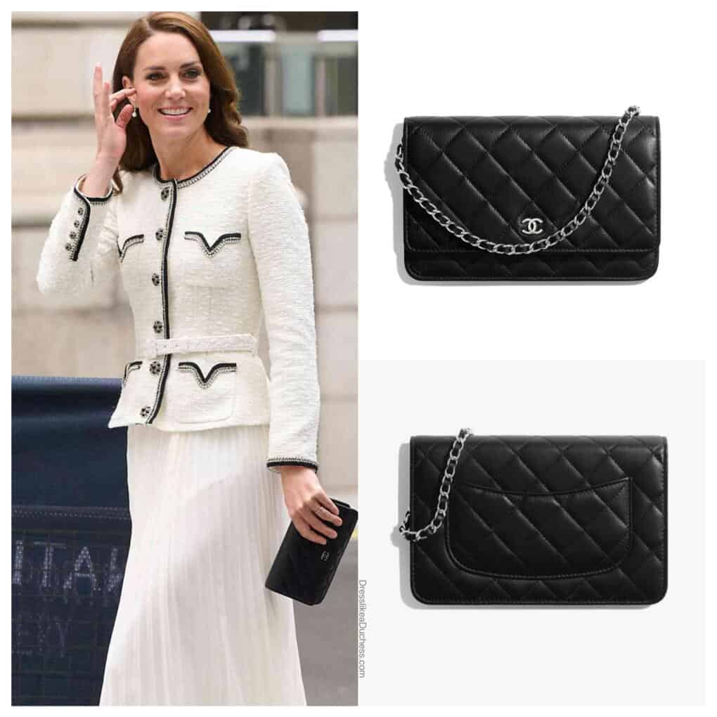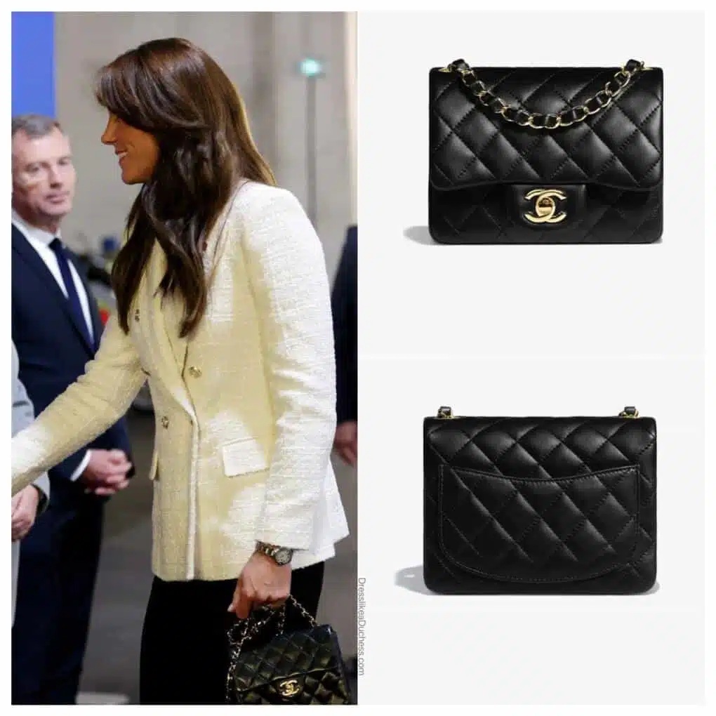 أثبتت كيت عشقها لكل ما هو مميز من كوكو شانيل، حيث حملت هذه الحقيبة السوداء الجديدة لأول مرة في مباراة ربع نهائي كأس العالم للرغبي. صُنعت هذه الحقيبة الأنيقة المبطّنة بالألماس من جلد الحمل الناعم، وهي مُزيّنة بقفل "شانيل" الدوّار الشهير CC. يمكن حمل الحقيبة كحقيبة كروس بودي بفضل سلسلة معدنية ذهبية اللون وجلد أسود.