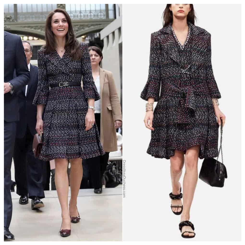 خلال زيارتها لمدينة النور ضمن جولتها، ارتدت كيت معطفاً من التويد من مجموعة المصمّم الجاهزة لربيع وصيف 2017. وباختيارها ارتداء تصميمات العلامة التجارية الشهيرة في برج إيفل بباريس في آذار/مارس 2017، كانت كيت مستعدة لإظهار ذوقها الرفيع في عالم الموضة في عاصمة الموضة العالمية. كانت الأميرة الراحلة ديانا أيضاً من أشد المعجبين بـ"شانيل"، حيث ارتدت بدلات تنانير، وفساتين بأزرار، ومعاطف طويلة، وحملت حقائب سوداء مبطّنة من العلامة.