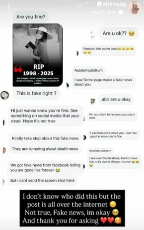 سارعت صانعة المحتوى الخاص بالطبخ الى قطع الطريق أمام الشائعات، وردت على أسئلة متابعيها الذين عبروا عن قلقهم من الشائعات المنتشرة، وأكدت أن كل ما يتم تداوله غير صحيح وعار عن الصحة.