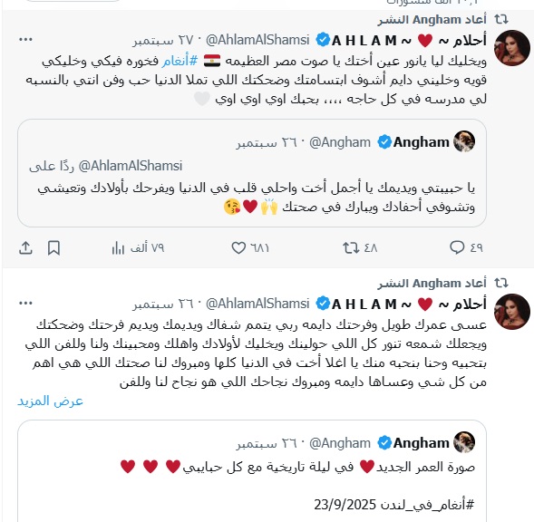 رسائل متبادلة بين النجمتين أنغام وأحلام كشفت عن عمق الصداقة والود بينهما حيث بدأت الرسائل بنشر أنغام، على حسابها الخاص بمنصة "X"، صورة من حفلها الأخير في العاصمة البريطانية لندن، والذي شهد حضورًا جماهيريًا ضخمًا، وكتبت عليها قائلة: "صورة العمر الجديد في ليلة تاريخية مع كل حبايبي".