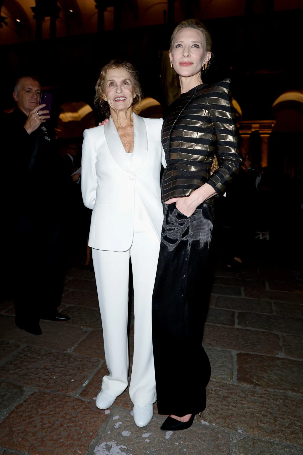 • كيت بلانشيت بدت كأنها خرجت من لوحة فنية بجاكيت مقلّمة بألوان الذهب والأسود، مع بنطلون مزخرف بطابع كلاسيكي، بينما اتجهت لورين هاتون إلى الأبيض الكامل في بدلة مع حذاء رياضي، مجسدةً فلسفة أرماني في الموازنة بين الأناقة والراحة.