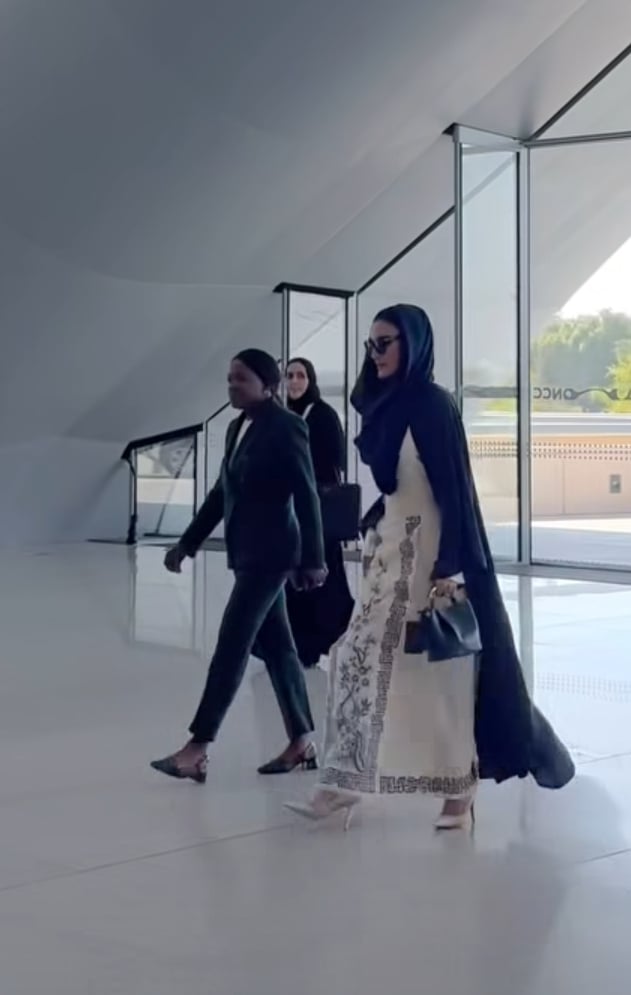 ومن الناحية الجمالية، غطّت الشيخة القطرية في الإطلالتين شعرها بالوشاح، وطبّقت مكياجاً ناعماً وطبيعياً، يرتكز على الألوان البرونزية الدافئة المفضّلة لها، ومزجتها بلمسات وردية خفيفة وأحمر شفاه وردي نيود.