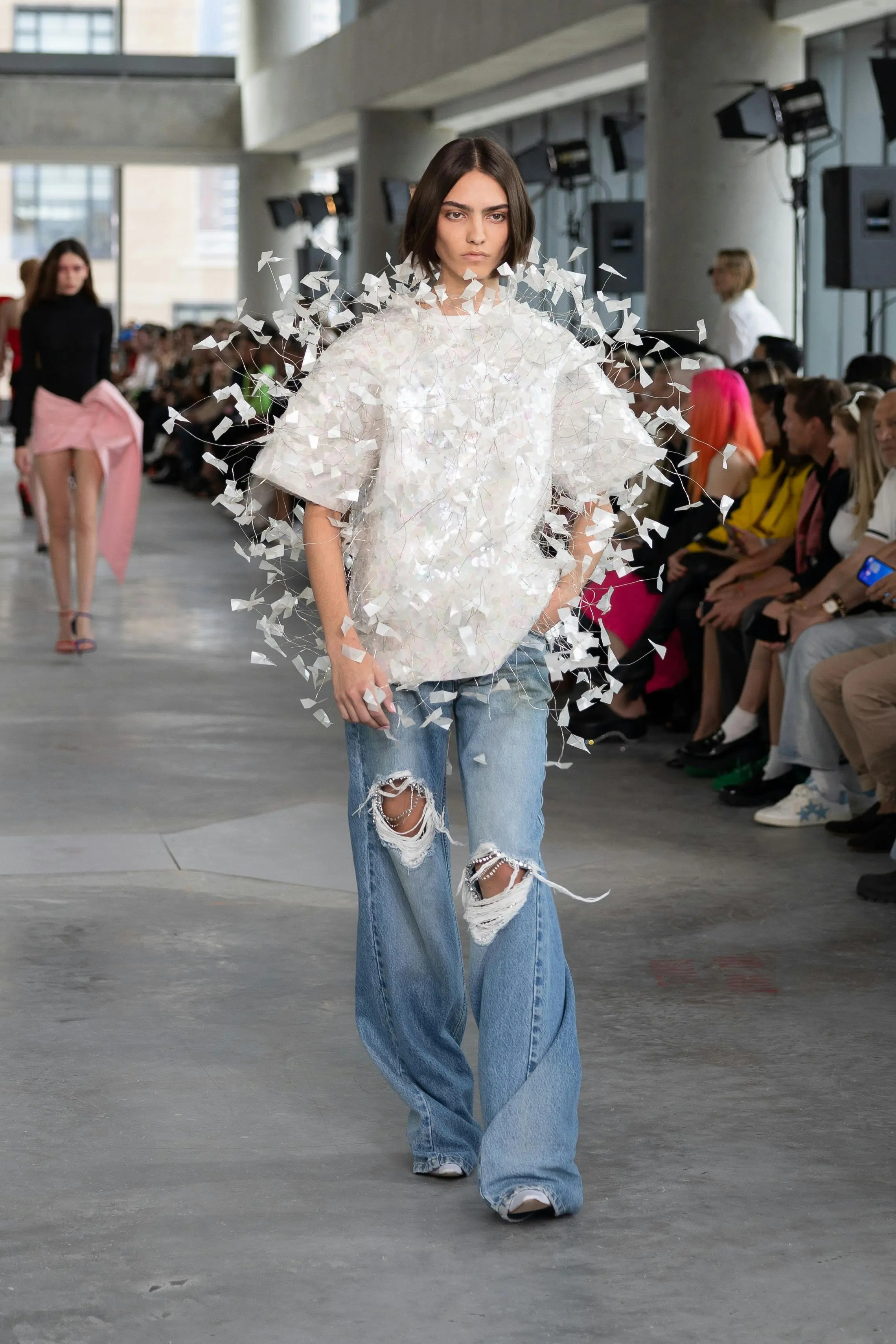 لم يغِب الجينز الممزق عن المشهد، بل عاد بإطلالة أكثر جرأة ووضوحاً. تم تقديمه بقصّات متنوعة، من الفضفاض إلى الضيق، مع تمزيقات تتفاوت بين الناعمة والجريئة، ليعكس روحاً شبابية متمردة لا تعرف القواعد.