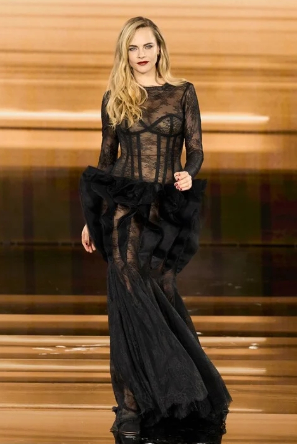 وتألقت الفنانة كارا ديليفين بفستان أنيق بتصميم عصري مميز بقماش الدانتيل المطرّز بقصة جريئة عند الصدر مع أكمام طويلة، وأُضيفت إليه حركة الكشاكش عند الورك، وينسدل في الأسفل بتنورة مؤلفة من طبقات من الدانتيل البارز، وأكملت إطلالتها بأحمر شفاه باللون الأحمر الفاقع.
