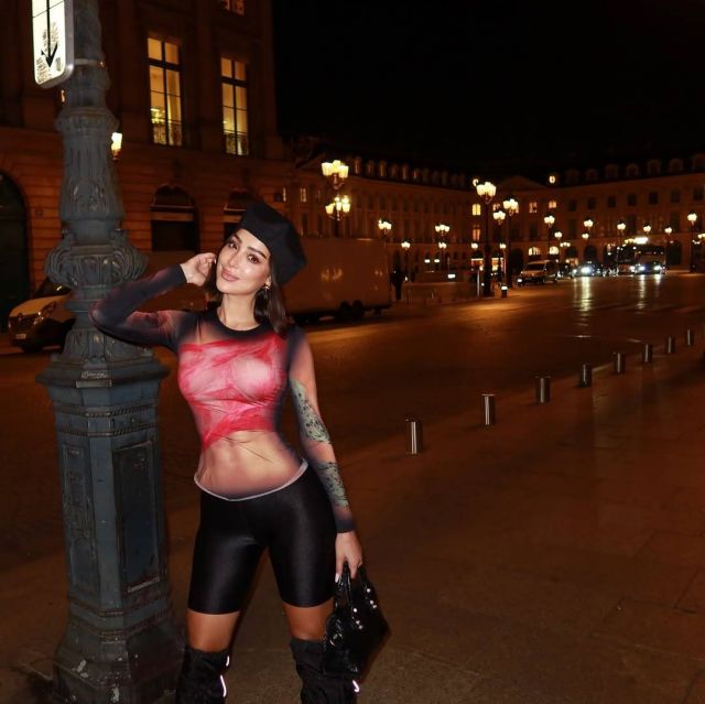 فبعد "تي شرت" القُبلة التي انتُقدت بسببها، أطلّت الفنانة المغربية من شوارع باريس بملابس كاجوال عبارة عن شورت أسود قصير "ليغنغ" مع بلوزة بسيطة باللون الأحمر الوردي، مطبوع عليها رسومات وخطوط لتصميم يبدو كبطن متقطعة مع أكمام من الشيفون مرسوم عليها وشوم متنوعة، في تصميم مربك للنظر وغير تقليدي وعصري.