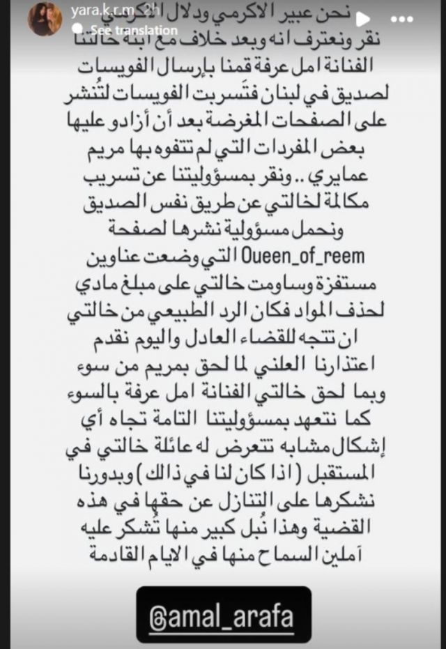 وجاء في البيان المنشور: "نحن عبير الأكرمي ودلال الأكرمي نقرّ ونعترف بأنه وبعد خلاف مع ابنة خالتنا الفنانة أمل عرفة، أرسلنا الفويسات لصديق في لبنان فتسربت لتنشر على الصفحات المغرضة... ونتحمل مسؤولية ما حصل، ونعتذر علناً لابنة خالتنا الفنانة ولابنتها مريم عمّا لحق بهما من أذى".