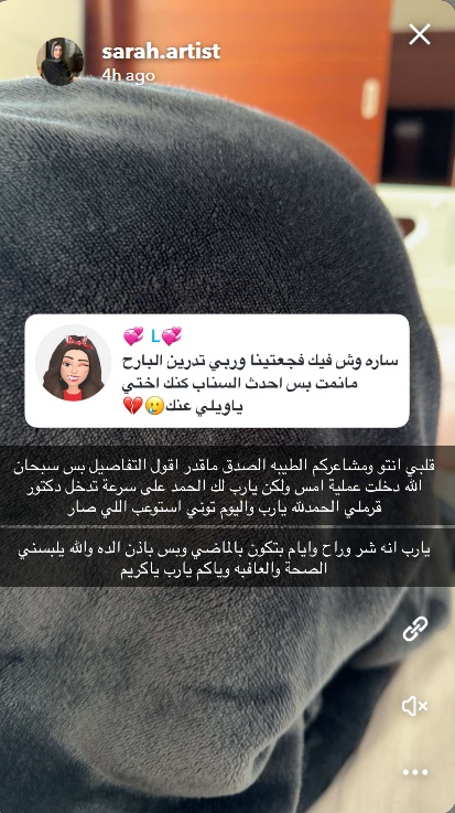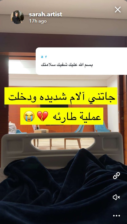 وقالت سارة في ردّها على بعض متابعيها الذين سألوا عن سبب دخولها المستشفى وخضوعها لجراحة عاجلة: "الصدق ما أقدر أقول التفاصيل بس سبحان الله دخلت العملية، ولكن يا رب لك الحمد على سرعة تدخل دكتور قرملي، الحمد لله واليوم توني أستوعب اللي صار، يا رب إنه شر وراح، وأيام بتكون بالماضي، والله يلبسني الصحة والعافية وياكم يا رب يا كريم".