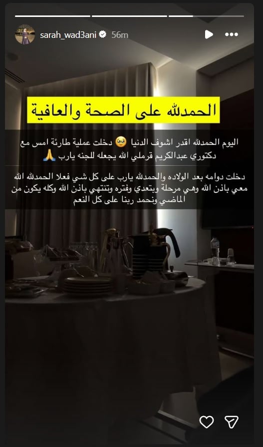 بعد أيام على وضع طفلها الخامس الذي أطلقت عليه اسم محمد، فاجأت صانعة المحتوى سارة الودعاني متابعيها على "سناب شات" بمرورها بظرف صحي طارئ استدعى دخولها المستشفى وإجراء عملية عاجلة، لم تكشف عن تفاصيلها الى الآن.