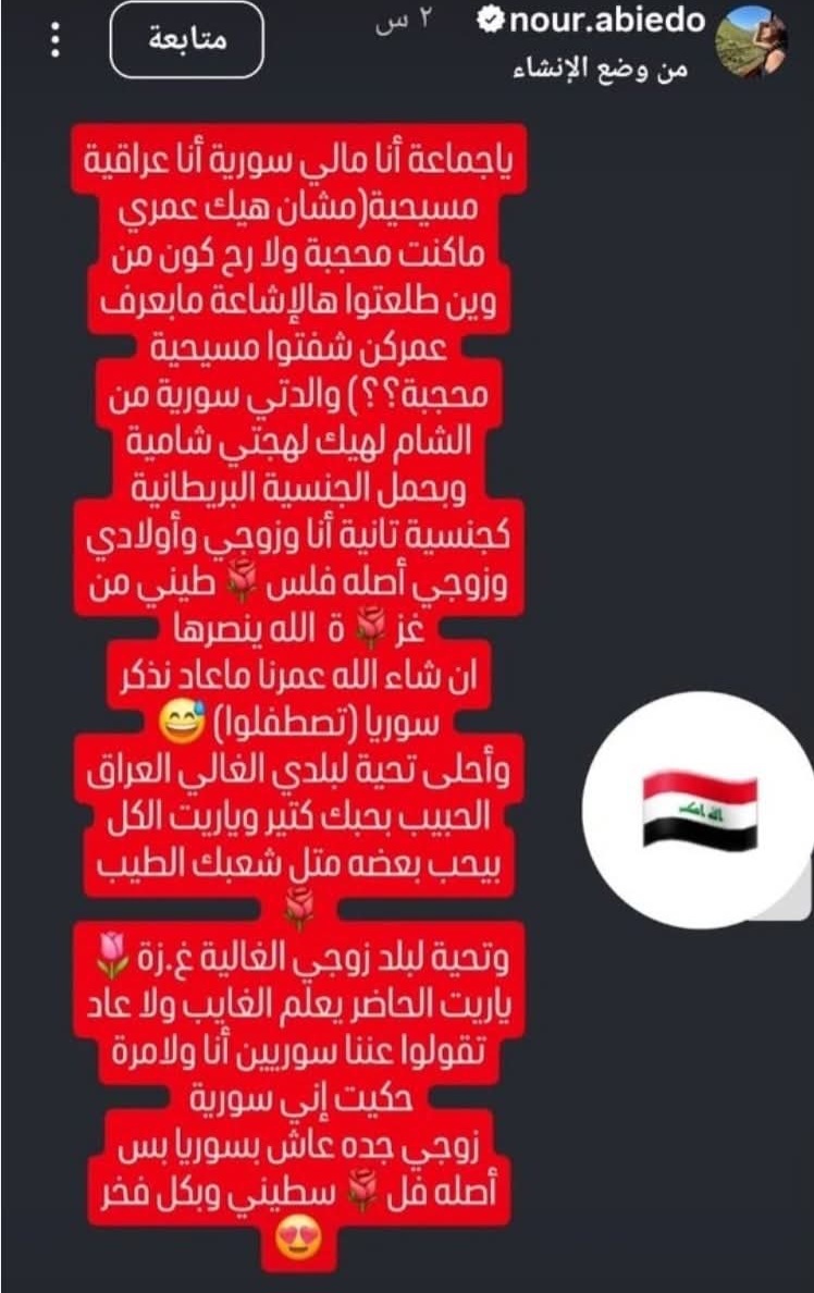 وكتبت في منشورها: "يا جماعة انا مني سورية، أنا عراقية مسيحية (مشان هيك عمري ما كنت محجبة ولا رح كون، من وين طلعتوا عالشائعة ما بعرف، عمركم شفتوا مسبحية محجبة)".