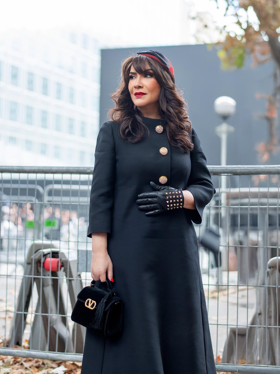 النجمة هدى حسين حضرت عرض "فالنتينو" بإطلالة ساحرة اختارت فيها فستاناً أسود طويلاً بقصة A-Line، تزيّنه أزرار ذهبية بارزة، ما أضفى على الإطلالة فخامة ملكية. نسّقت مع الفستان قبّعة باللونين الأحمر والأسود، إضافة إلى حقيبة من توقيع الدار، لتُكمل الطلّة بأسلوب درامي وأنيق.