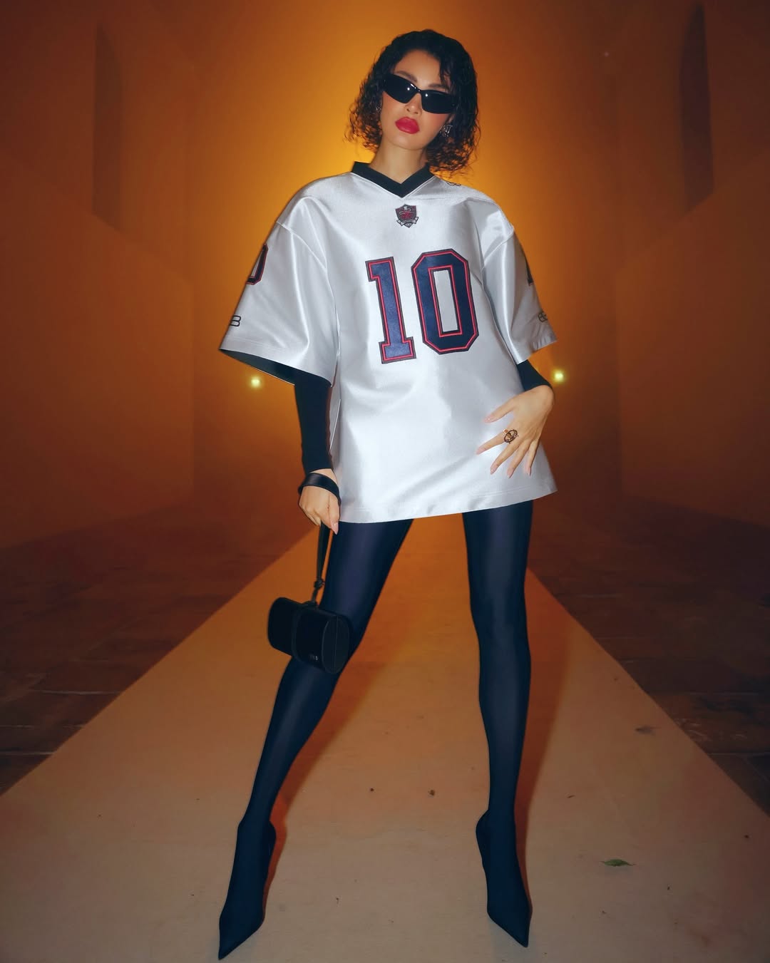 أما الفنانة أميمة طالب فقد كسرت التوقعات بإطلالة رياضية عصرية في عرض "بالنسياغا". نسّقت تي شيرت واسعة بيضاء مع توب أسود ضيّق بأكمام طويلة، وأضافت ليغينغ أسود لامعاً موصولاً بحذاء، ما عكس روح العلامة الجريئة والعملية.