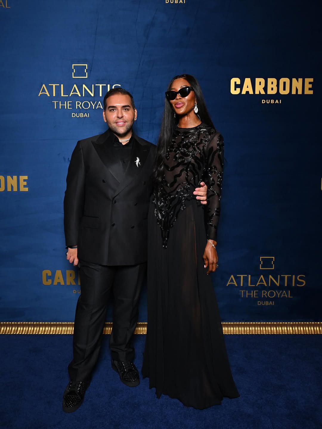 تواجدت عارضة الأزياء العالمية ناعومي كامبل في السهرة أيضاً، ولفتت الأنظار بحضورها المميز في دبي، وتألقت بفستان أسود طويل بتصميم يجمع بين الكلاسيكية واللمسات العصرية، وجاء ضيّقاً من الأعلى وبأكمام طويلة وياقة ضيّقة، مع قماش الشيفون بتطريزات لامعة على شكل تموّجات، لينسدل الفستان بقصة واسعة مع فُتحة جانبية عالية من قماش التل الناعم، وتزيّنت بمجوهرات ماسية رقيقة.