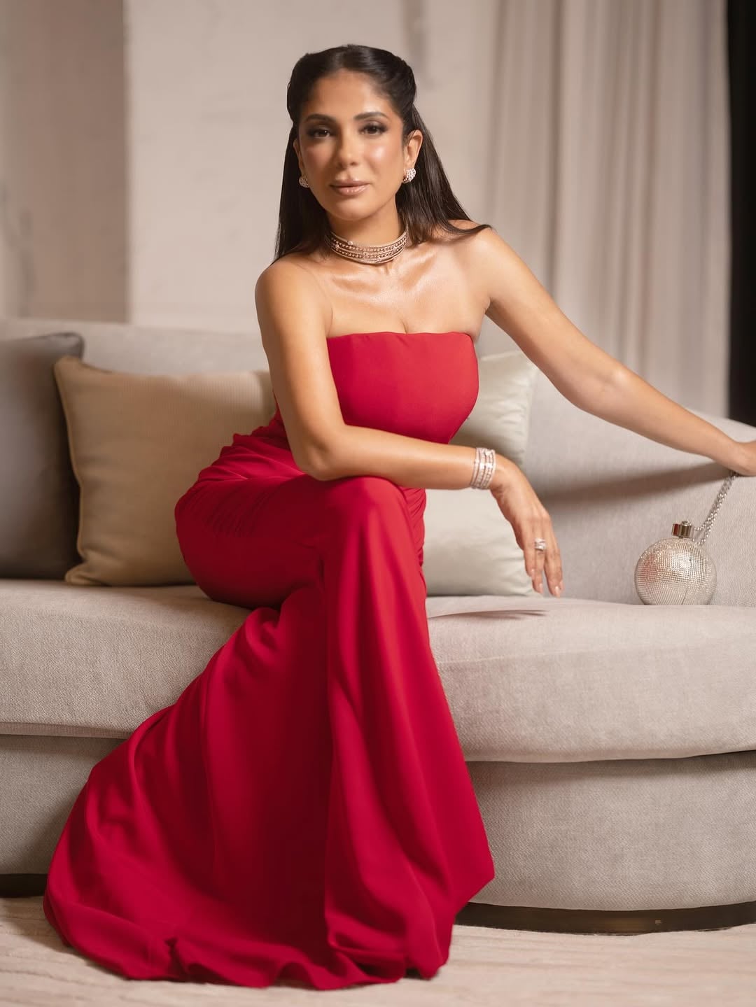 حضرت النجمة منى زكي مع زوجها النجم أحمد حلمي، واختارت فستاناً ناعماً "سترابلس" باللون الأحمر الموحّد من توقيع المصمّم اللبناني رامي قاضي، وجاء بتصميم مجسّم ومنسدل بقصة الحورية، مع ثنيات رقيقة عند الخصر. وأكملت إطلالتها الناعمة بمجوهرات ماسية، وحملت "كلاتش" على شكل كرة الاستديو.