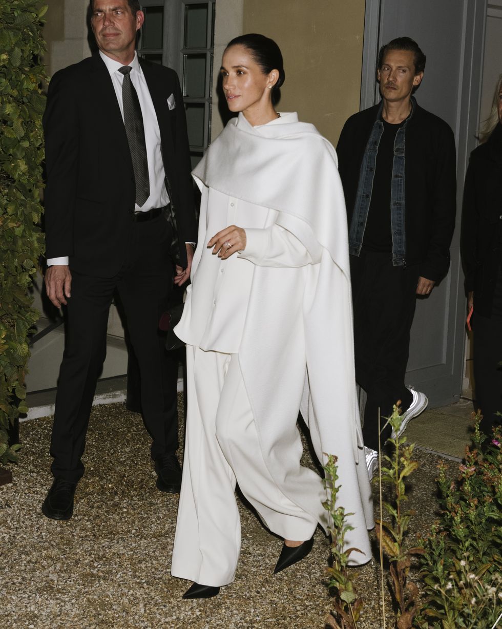 وفي هذه المناسبة، ارتدت ميغان ماركل طقماً أبيض بالكامل يضم بنطالاً واسع الساقين وسترةً مطابقة، من تصميم "بالنسياغا"، من إبداع صديقها القديم والمدير الإبداعي الجديد للعلامة، بيير باولو بيتشيولي.