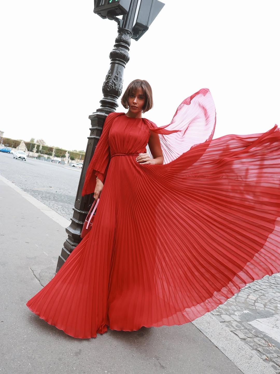 فستان أحمر بتفاصيل أنثوية ودرامية