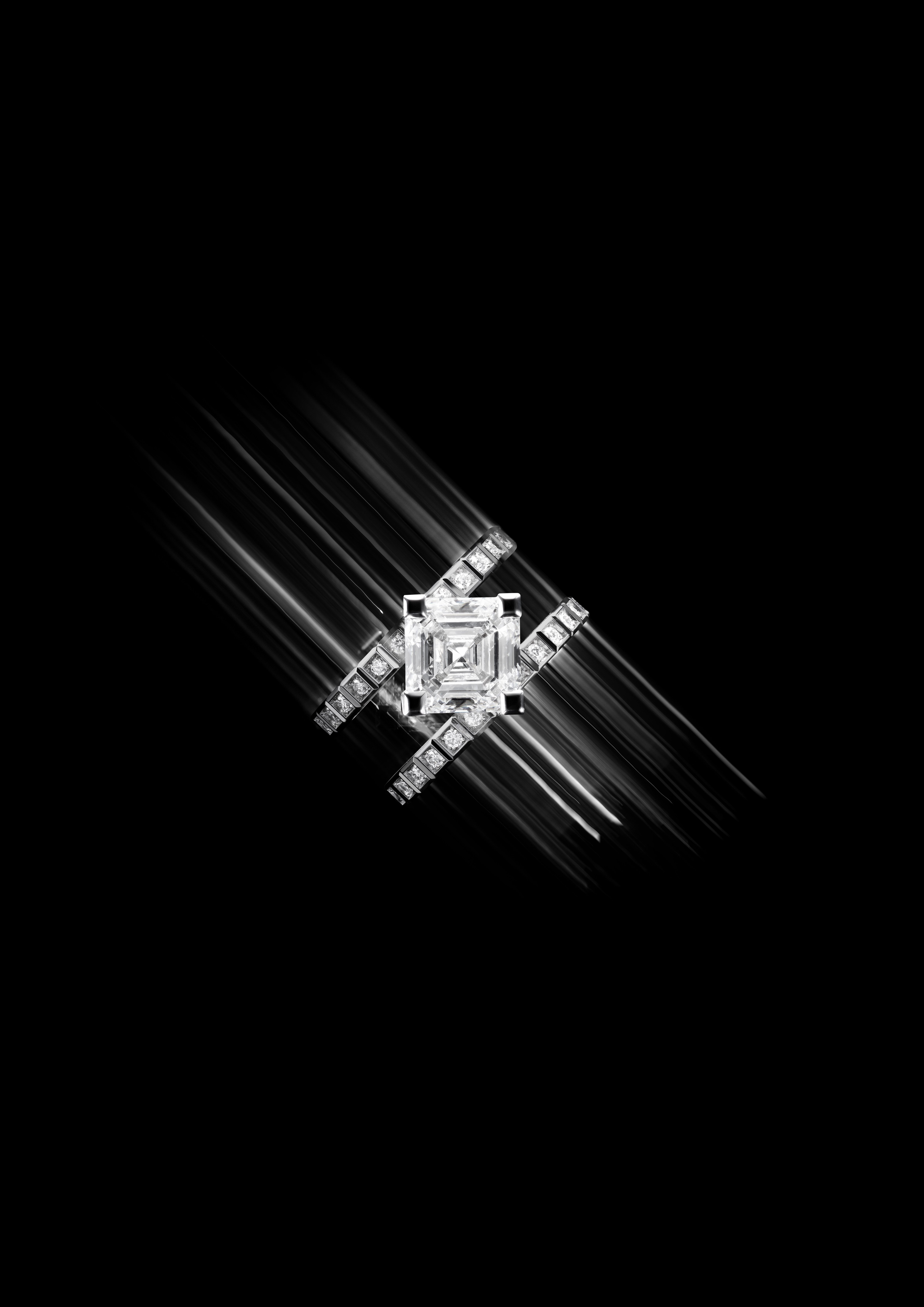 يجسّد قطع "آشر" Asscher للأحجار الكريمة، الذي كان سمة مميزة لعصر الـ"آرت ديكو"، تعبيراً جديداً وجريئاً في إبداعين متميزين: أحدهما خاتم يعيد إحياء الشكل الأيقوني للمجموعة بالحلقات المتعددة، ويتكلل بماسة رائعة بقطع "آشر" بوزن 3 قراريط موضوعة بشكل مائل على حلقتين متوازيتين من الذهب الأبيض الأخلاقي عيار 18 قيراطاً مرصّعتين بالألماس بقطع بريليانت.