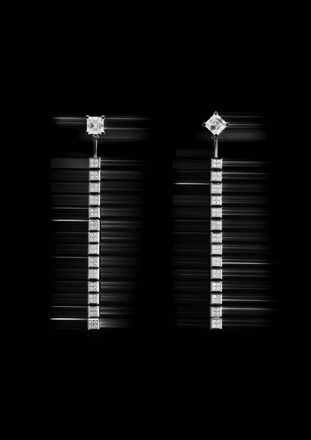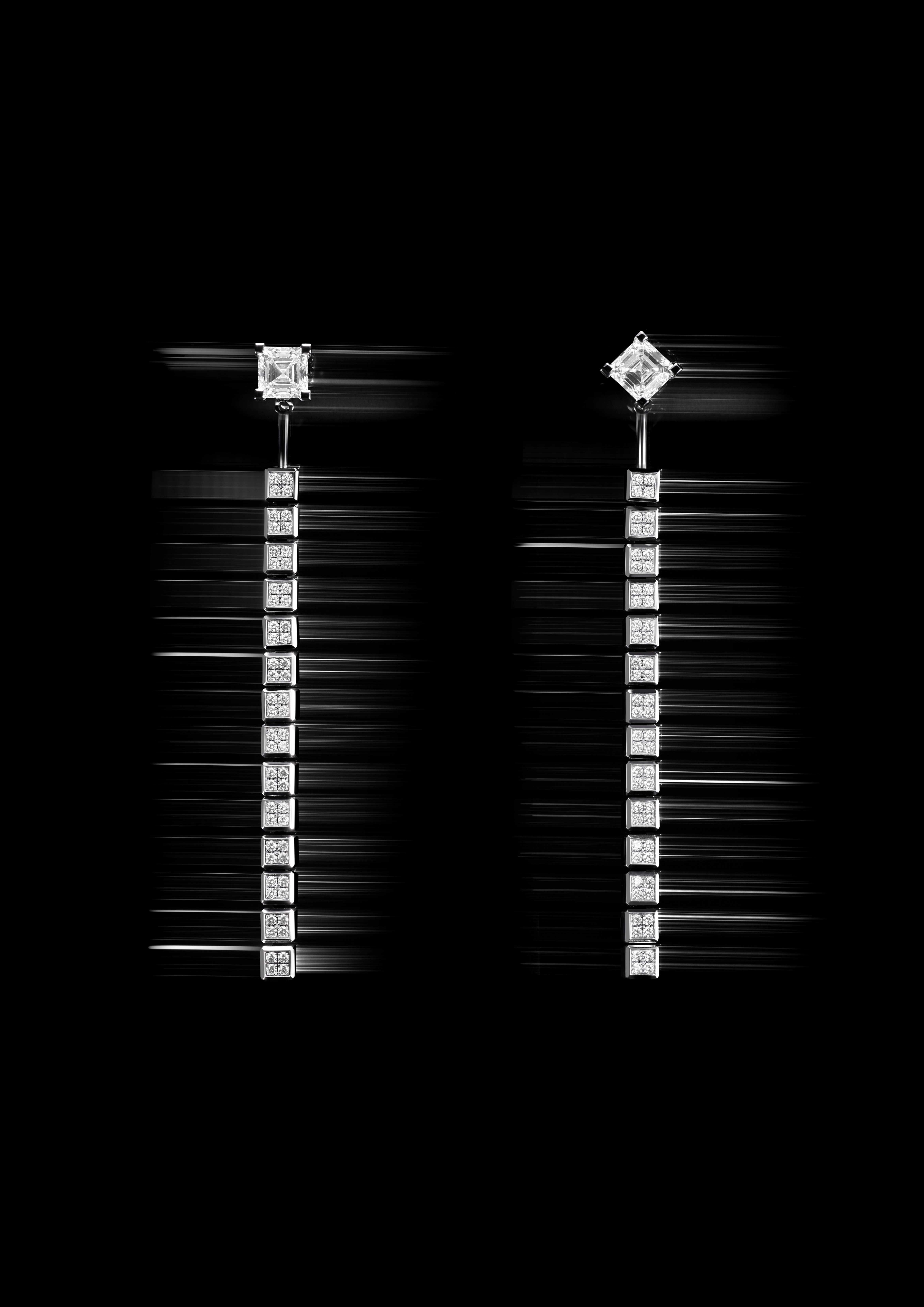 ولإبراز هذه الأناقة الهندسية، رصّع زوج من الأقراط بألماس سوليتير بقطع "آشر" بوزن 1,2 قيراط، يتدلى منهما خط انسيابي مكوّن من 14 مكعباً مرصّعة بالألماس. ويمكن فصل هذا الخط من مكعبات الألماس في أحد القرطين أو كلاهما، بحيث يتيح إمكانية تنسيق غير متناظر أو تنسيق أكثر بساطة.