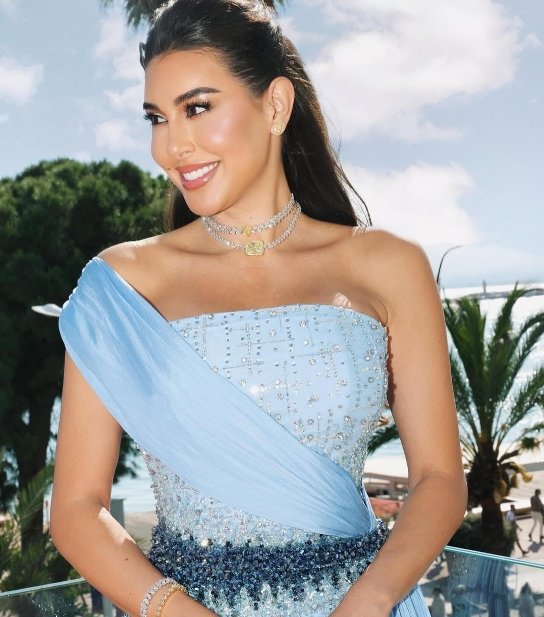 واختارت لمهرجان "كان السينمائي" هذا العام إطلالة أنيقة بفستان أصفر اللون من تصميم جان بيار خوري، وتألقت بمجموعة مميزة من المجوهرات من شوبارد، حيث ارتدت عقداً مرصعاً بأحجار الألماس مختلفة القطع، تدلى منه حجر ياقوت أزرق بحجم ضخم وبارز ونسقته مع أقراط ماسية بتصميم شاندلير مرصعة بالألماس، بالإضافة إلى خاتم مرصع بحجر ياقوت أزرق مركزي.