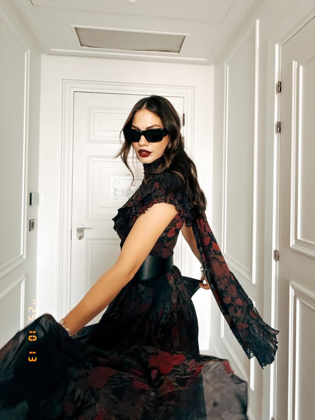 واختارت أوزديمير فستاناً أسود اللون يتميز بقماش شفّاف مطرّز، وجاء من الأعلى بتصميم ضيّق مع ياقة دائرية عالية وشال يمتد إلى الخلف وحركة كشاكش بتدرّجات ناعمة عند الصدر في حركة أنثوية أنيقة، وينسدل الثوب الأنيق من الأسفل بتنورة واسعة بطبقات متداخلة. وأضافت ديميت الى التصميم حزاماً من الجلد الأسود بتصميم عريض على هيئة كورسية يبرز خصرها النحيل، وهو ما أضفى المزيد من الأنوثة.