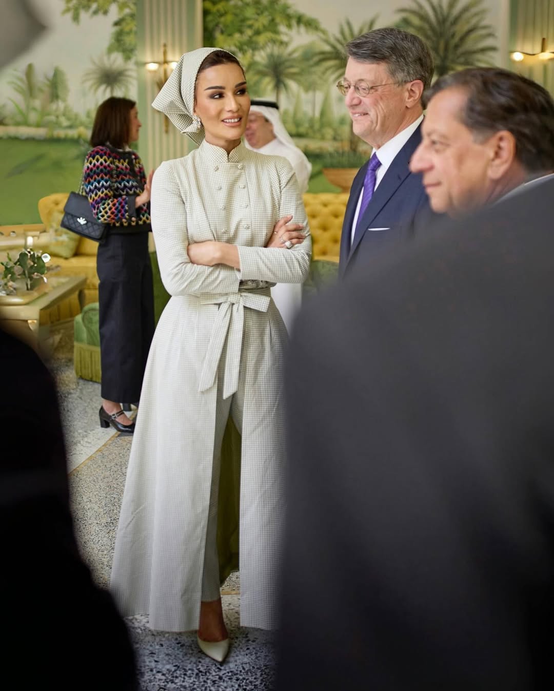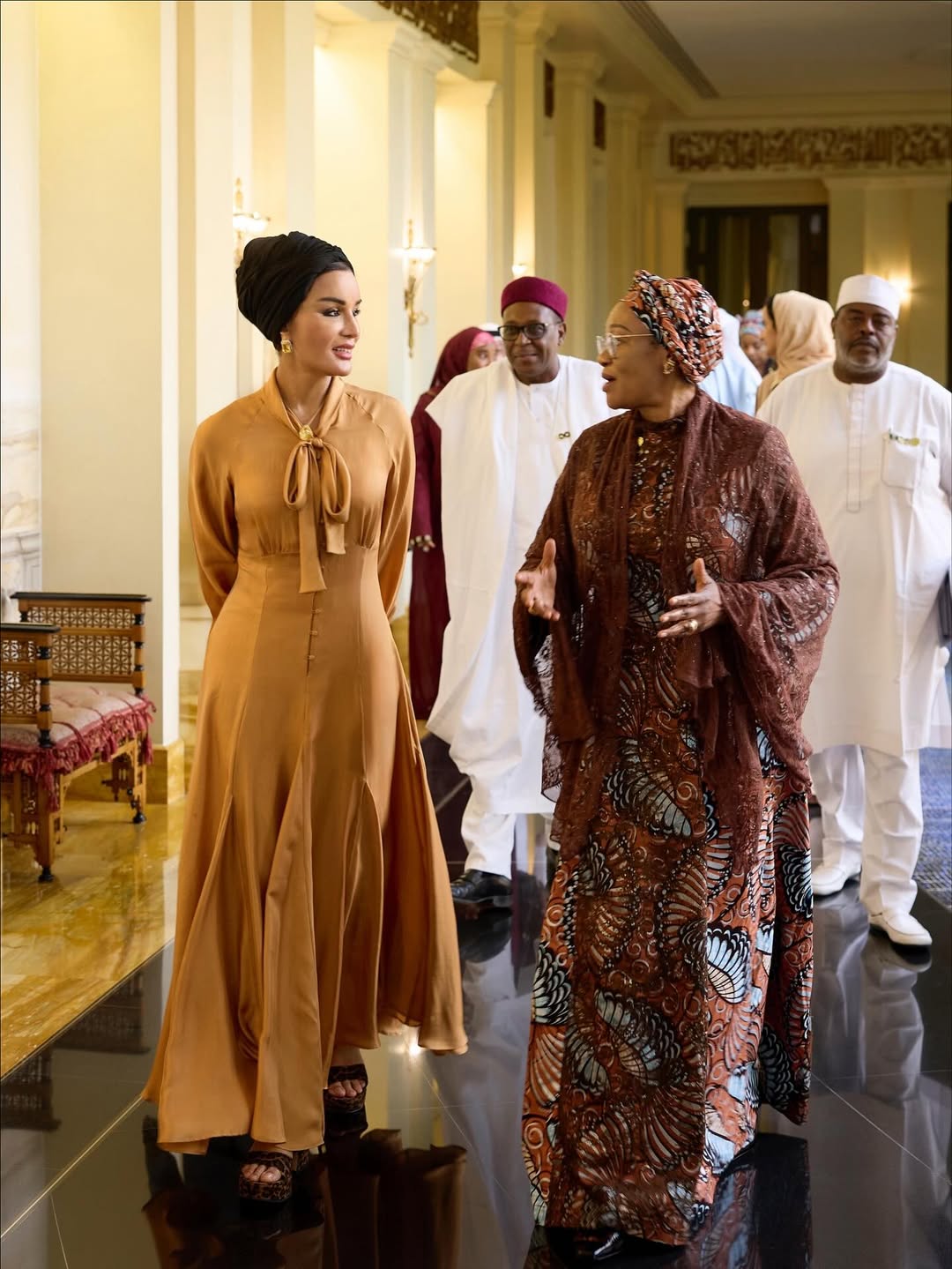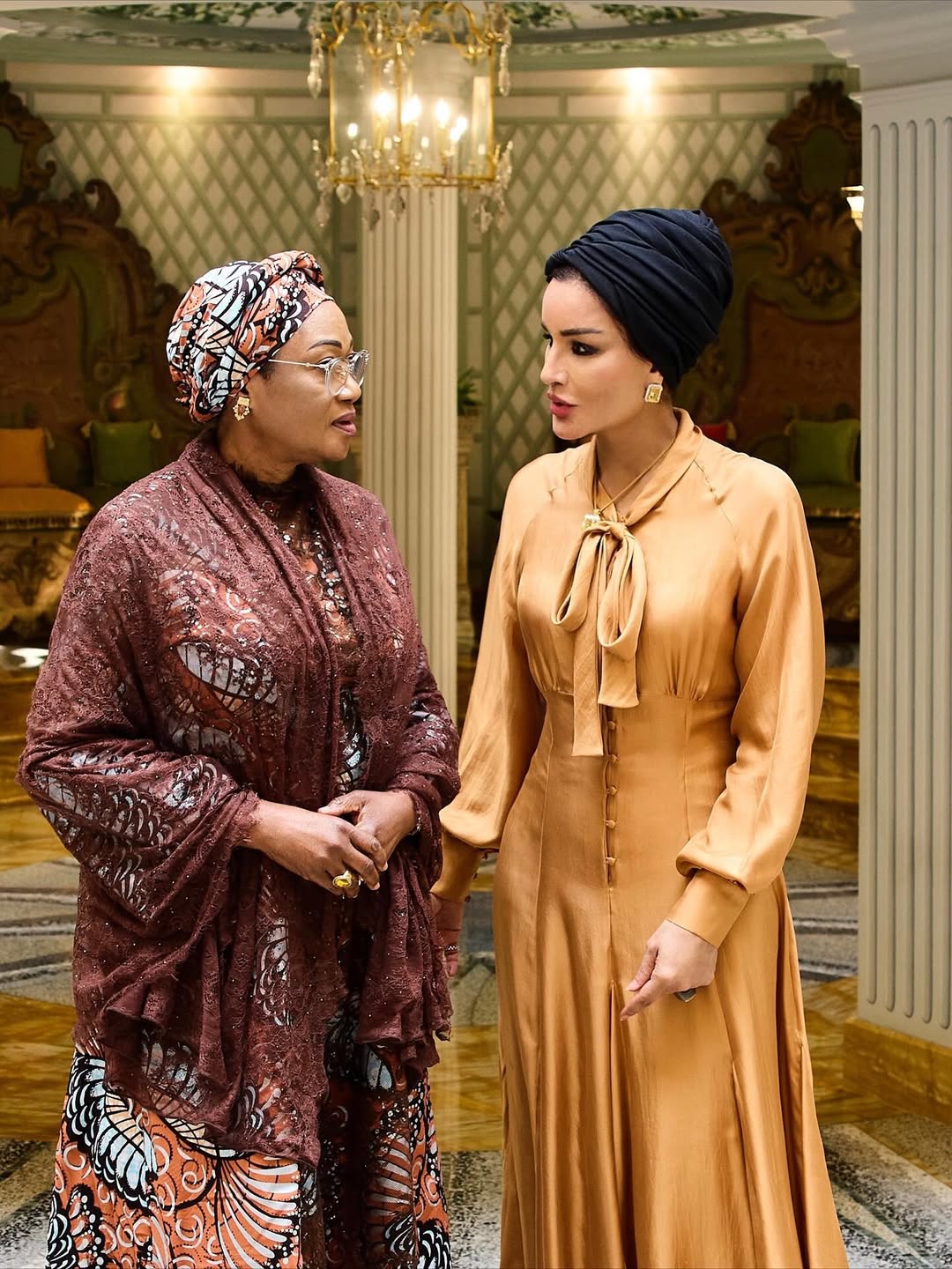 لا تحتاج الشيخة موزة إلى كثير من الجهد لتلفت الأنظار، حضورها وحده يكفي. لكن في لقائها الأخير مع السيدة الأولى لنيجيريا في قصر الوجبة، طغت التفاصيل على المشهد: فستان بلون ترابي دافئ، توربان أنيق، وإطلالة تقول الكثير من دون أن تنطق بكلمة.