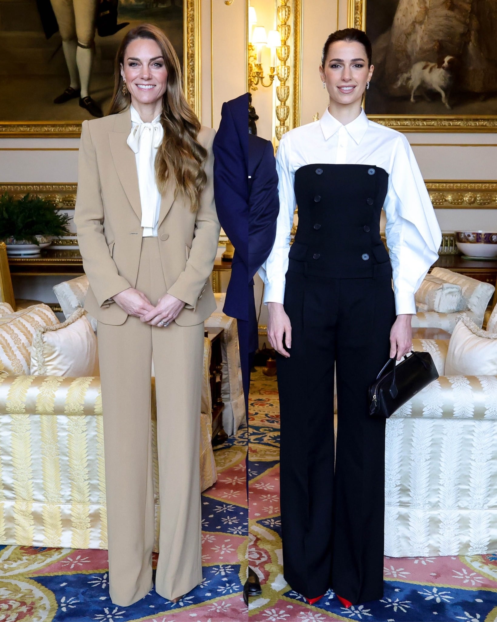 في الجهة المقابلة، ظهرت الأميرة كيت ميدلتون بإطلالة تحمل توقيعها الكلاسيكي المعروف، ولكن بلمسات حديثة تليق بالمناسبة. ارتدت بدلة أنيقة باللون البيج المحايد، مؤلّفة من جاكيت وبنطلون بقصّة مستقيمة تُجسّد البساطة الملكية من دون تكلّف. اللافت في الإطلالة كان اختيارها لقميص أبيض بياقة مُزيّنة بعقدة Bow Tie، وهي لمسة أنثوية كلاسيكية تتكرر كثيراً في خزانة كيت، وتُعطي طابعاً ناعماً من دون أن تُفقد الطلّة الرسمية جديتها. اللون المحايد للبدلة منح الإطلالة هدوءاً بصرياً يليق بمقام المناسبة.