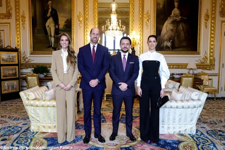 في زيارة مَلكية جمعت بين العراقة البريطانية والأناقة الهادئة الوافدة من عمّان، لفتت الأميرة رجوة الحسين الأنظار بإطلالة تجمع بين الجرأة العصرية والرقي الكلاسيكي، خلال استقبالها هي والأمير الحسين من جانب الأمير ويليام وزوجته كيت ميدلتون في قلعة وندسور.