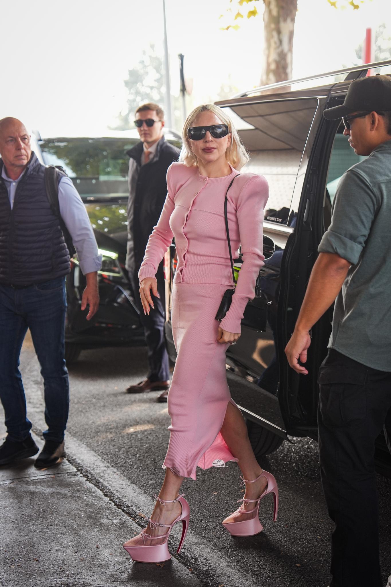 ونسّقت الليدي غاغا مع ملابسها الوردية، حقيبة كتف سوداء صغيرة بتصميم Mini Kelly من Hermés، ولم تتزيّن بأي مجوهرات، بل اكتفت بخاتمها الماسي الضخم.