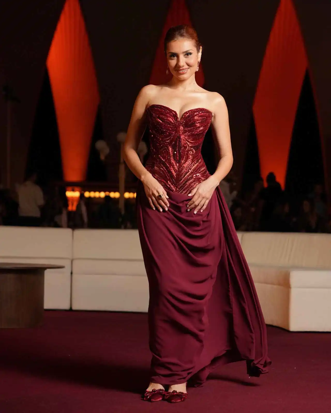 عادت جيهان الشماشرجي إلى السجادة الحمراء بفستان عنابي داكن، مزين بتطريزات براقة وتصميم أكثر دفئاً ينسجم مع أجواء الخريف.