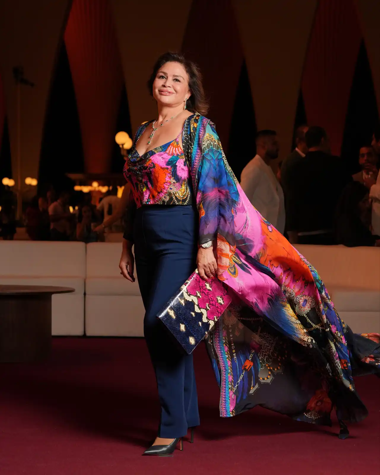 ظهرت إلهام شاهين بإطلالة خارجة عن المألوف، حيث ارتدت توب مزخرف وكاب طويل فوق بنطلون أزرق داكن. الإكسسوارات متعددة الألوان أضافت حيوية وعصرية إلى الإطلالة، مؤكدة على جرأتها في كسر النمط الكلاسيكي المعتاد.