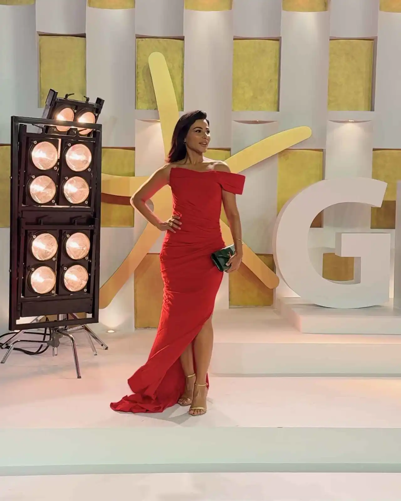أطلّت جويل بفستان أسود لامع بفتحة ساق وظهر مكشوف وأكمام طويلة، ونسّقت معه حقيبة وحذاء باللون الذهبي. إطلالة جمعت بين الجاذبية والكلاسيكية.