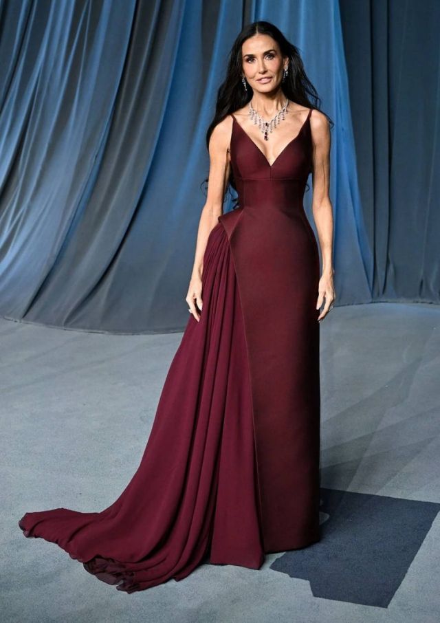 اختارت النجمة العالمية ديمي مور فستاناً أنيقاً بتصميم فخم باللون البني البوردو العنابي من Prada من الساتان، بحمّالات رفيعة مع فُتحة V عميقة عند الصدر وبتصميم طويل ومستقيم، مع تفصيل جانبي وغير متماثل عند الورك بأسلوب "بليسيه" أضاف حركة خفيفة الى القماش مع تفاصيل الجورجيت المتدلية. وزيّنت الفستان الأنيق بمجوهرات فاخرة عبارة عن أقراط وقلادة من الماس وأحجار بنفس لون الثوب.