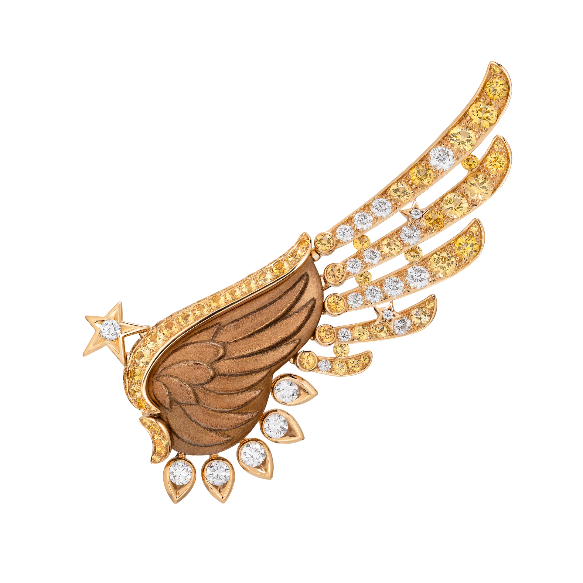 يأتي هذا البروش الرائع من مجموعة Reach For The Stars من Chanel High Jewellery كتحفة فنية متقنة تجمع بين الفخامة والتفرد. صُنع البروش من الذهب الأصفر الفاخر، حيث يتلألأ بفضل الترصيع الدقيق بأحجار الألماس البرّاقة والياقوت الأصفر الذي يضيف دفئاً ولمسة فريدة من الإشراق.
