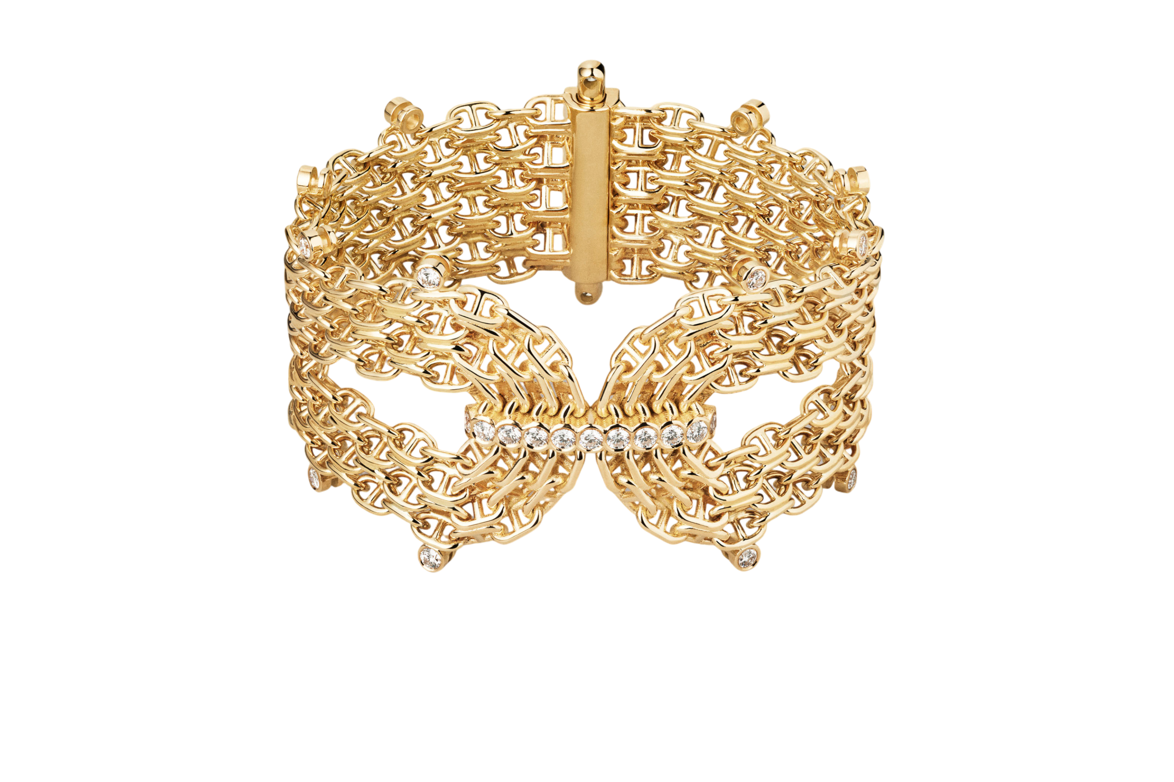 سوار من مجموعة Chaîne D’Ancre من Hermés Jewellery بعدسة ©Maud Rémy-Lonvis، يُجسّد روح الفخامة والحِرفية العالية التي تتميز بها الدار. تم تصميم السوار من الذهب الأصفر الفاخر، ويتميز بتزيينه بـ 59 قطعة ألماس متلألئة، بإجمالي وزن 2.54 قيراط، ما يضفي عليه بريقاً خاصاً وأناقة لا مثيل لها. يُعد هذا السوار تعبيراً مثالياً عن التقاليد العريقة لدارHermés في صياغة المجوهرات، ويمنح مَن ترتديه لمسة فريدة من الرقي والجمال.