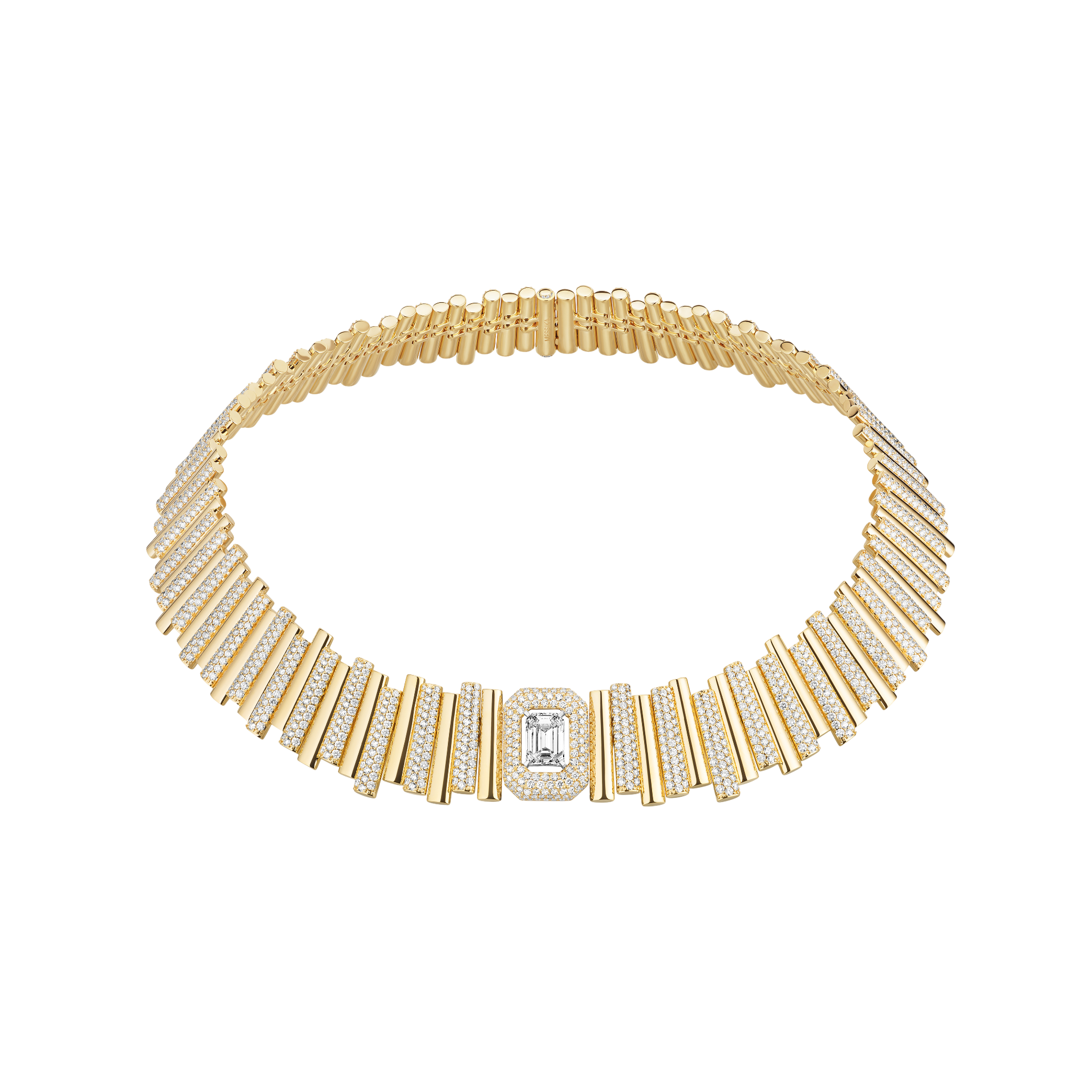 يشكّل هذا العقد المميز من مجموعة Terres d›Instinct من Messika تحفة فنية استثنائية تجسّد الفخامة والرقي في تصميم المجوهرات. مصنوع من الذهب الأصفر الفاخر، ومزيّن بأحجار الماس اللامعة التي تضفي عليه بريقاً لا مثيل له، ما يجعل منه قطعة مركزية تسرق الأنظار. يتميز هذا العقد بحجمه البارز وتصميمه الكبير الذي يعكس حضوراً قوياً وأنيقاً، حيث تلتقي الحِرفية العالية مع الجمال الطبيعي للمواد المختارة بعناية. تمثل مجموعة Terres d’Instinct إلهاماً مستمداً من الأرض والعناصر الطبيعية، ما يمنح العقد طابعاً فريداً ينبض بالحياة ويحتفي بجمال الطبيعة بأسلوب معاصر.