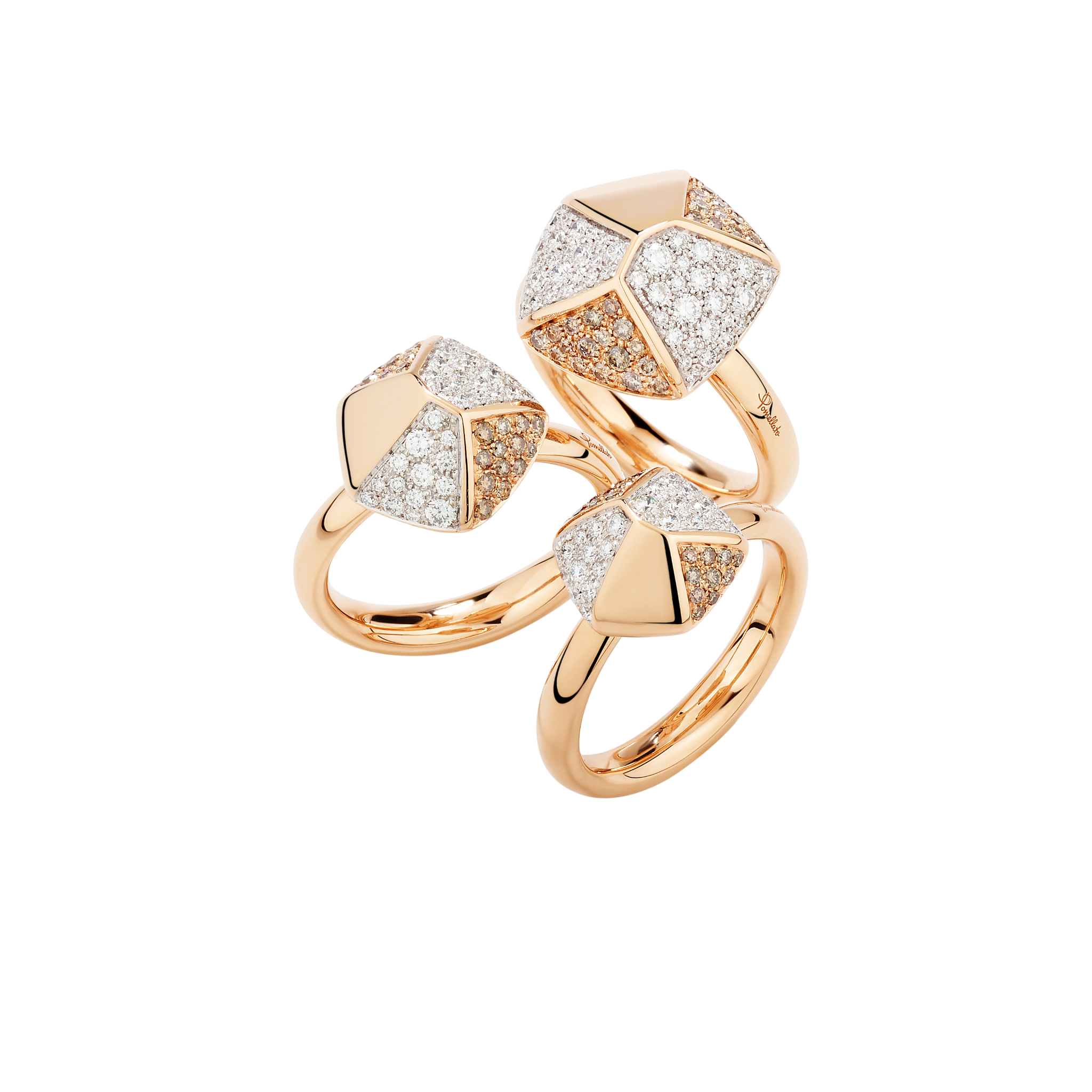 تقدّم دار Pomellato في مجموعة Pentagoni تصاميم مبتكَرة تجمع بين الفخامة والحرية في التعبير عن الذات. تتألف هذه المجموعة من ثلاثة خواتم مصنوعة من الذهب الوردي، ومرصّعة بأحجار الألماس الأبيض والبنّي التي تضفي تبايناً أنيقاً وفريداً.