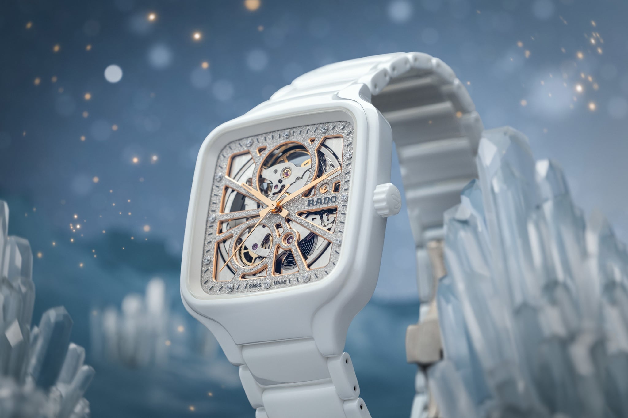يشكل عالم من الكريستال والثلج والجليد خلفية شتوية لساعة True Square Open Heart. يُجسّد اللون الأبيض النقي لعلبة الساعة وتاج ضبطها وسوارها المصنوع من السيراميك المصقول فائق التقنية، إلى جانب التشطيب الحبيبي البراق على قرصها الروديومي، وهو تصميم مستوحى من تقنية تصنيع حصرية لدى Rado ومؤشراتها الماسية الاثني عشر، مشهداً بصريا يحاكي بريق رقاقات الثلج ولمسة الهواء الجبلي البارد.