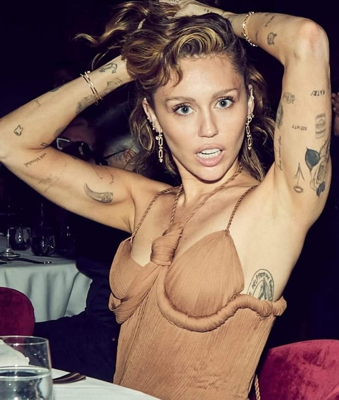 نسقت النجمة مايلي سايرس فستانها بتصميم مبتكر باللون البني الفاتح بمجوهة "كليو" من مارلي نيويورك عبارة عن أقراط ذهبية متدلية على رقبتها ومرصعة بالألماس بتصميم رقيق مع اسوارة من نفس التصميم وخاتم ناعم.