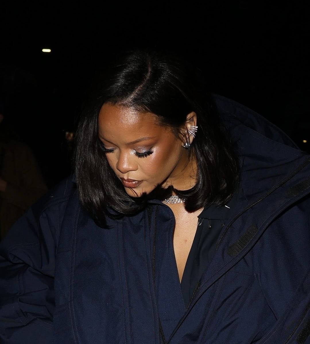 ارتدت النجمة ريهانا معطفا ضخما باللون الكحلي ونسقته بمجموعة متنوعة من تصاميم fifth avenue وcleo وTipTop، عبارة عن قلادة ماسية بتصميم ناعم مع أقراط رقيقة تلائم ملابسها واللوك النهائي.