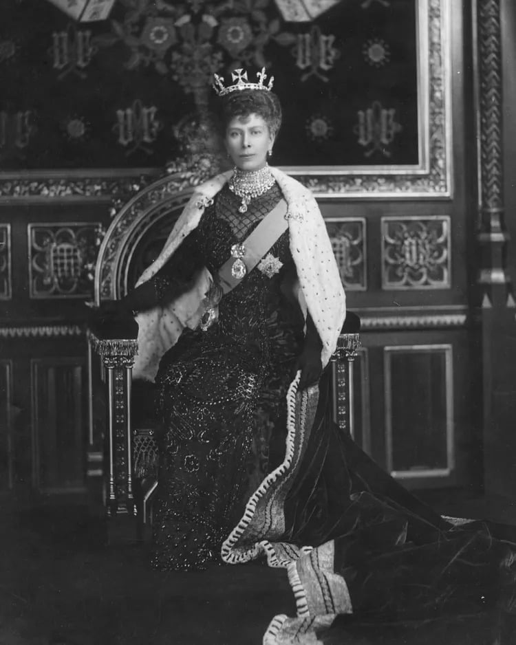 الملكة ماري حوالى عام 1911 وهي ترتدي ماسيتي كولينان الثالث والرابع كبروش معلق فوق وشاحها.