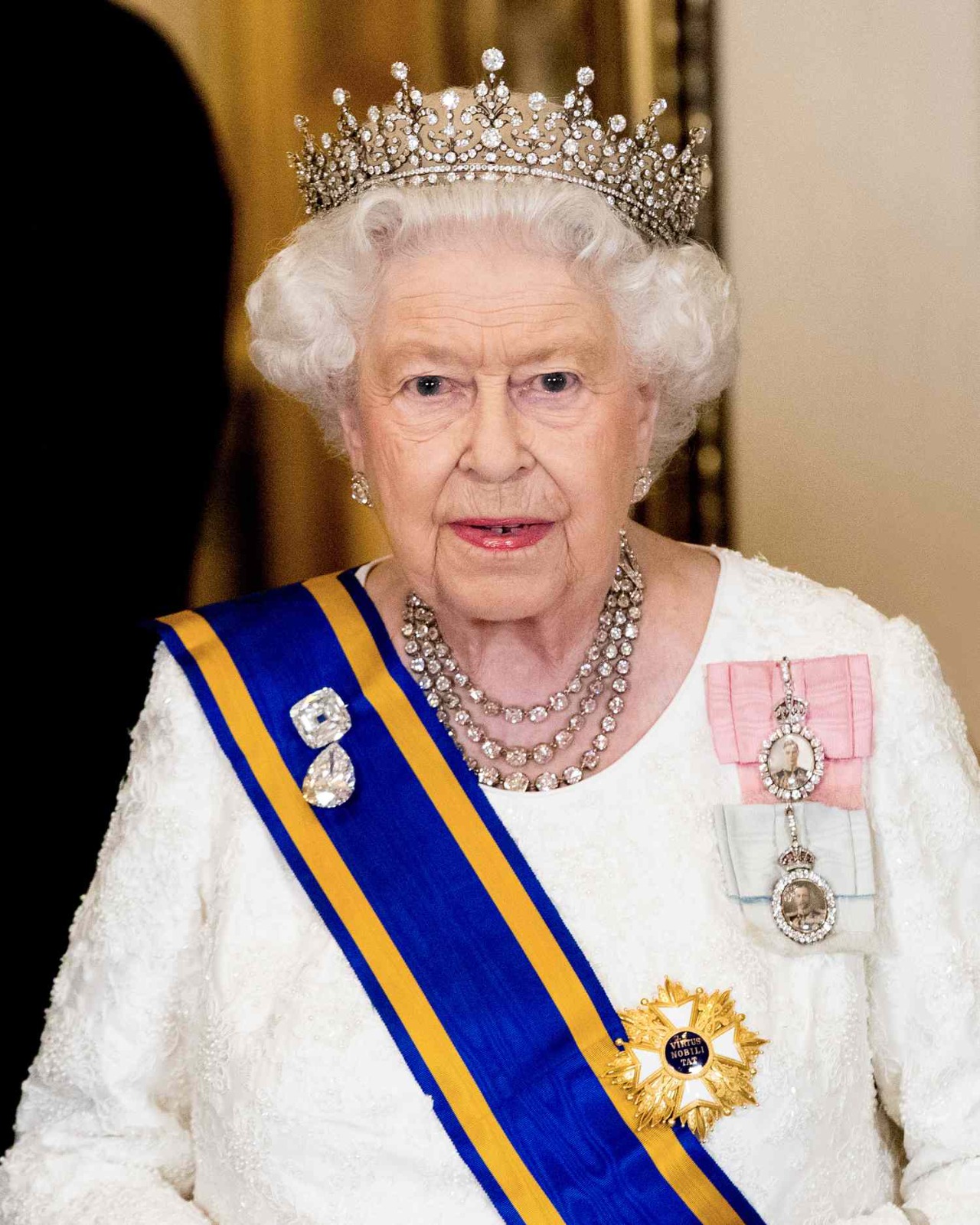 الملكة إليزابيث الثانية ترتدي البروش خلال مأدبة عشاء رسمية في عام 2018
