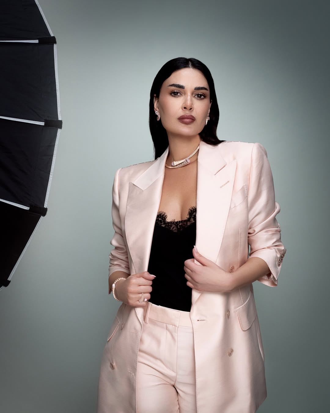 نسّقت النجمة سيرين عبدالنور إطلالتها العملية الأنيقة بلمسات فخمة وناعمة من مجموعة "مارلي"، واختارت تصميم "كليو" الهَرَمي لتضفي لمسة من الفخامة على إطلالتها الكلاسيكية التي جاءت على شكل بدلة باللون الوردي اللامع، مع توب سوداء مزيّنة بالدانتيل. وأكملت إطلالتها بأساور وخاتم بنفس التصميم الهرمي المبتكَر والمرصّع بالماس، والذي يناسب كل الإطلالات والمناسبات.