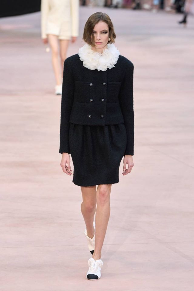 ركّزت المجموعة على أطقم التويد الأيقونية المؤلفة من جاكيت وتنورة قصيرة أو متوسطة الطول، وهي من أبرز رموز الدار. لكن هذه المرة، جاءت بتفاصيل أكثر حداثةً، مثل قصّات مستقيمة وألوان حيادية تتدرّج بين الرمادي، الأسود، الكاكي والوردي الباهت، مما أضفى على الإطلالات لمسة حضرية تناسب إيقاع الحياة اليومية للمرأة العصرية.