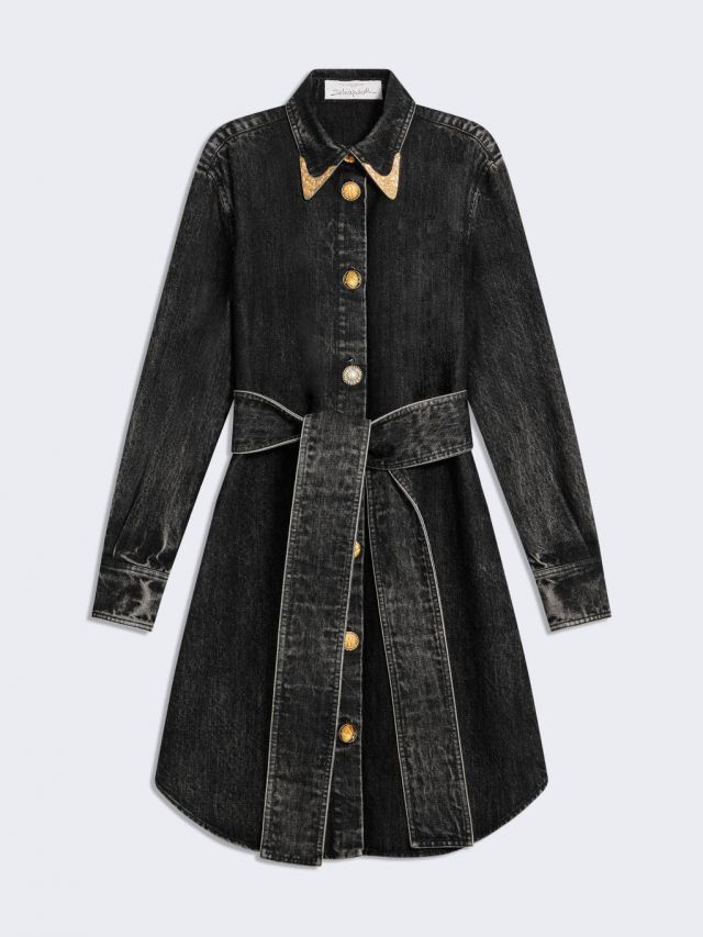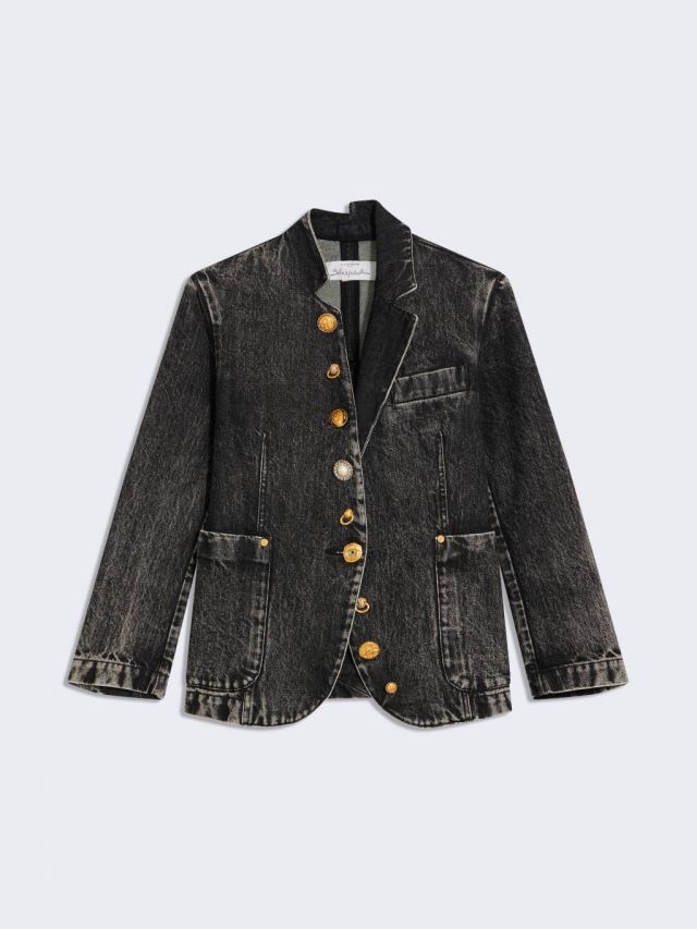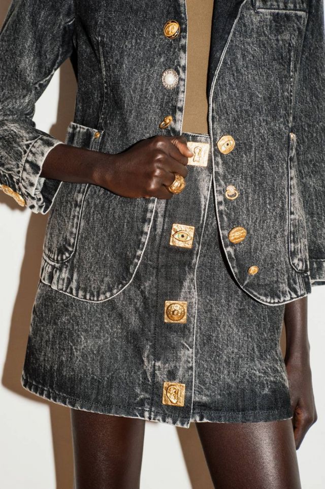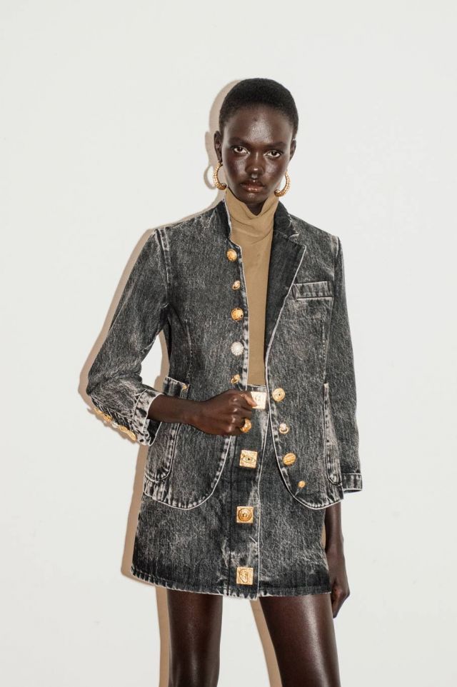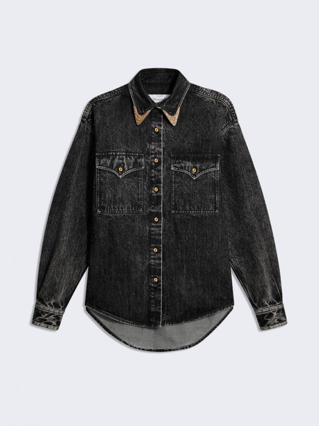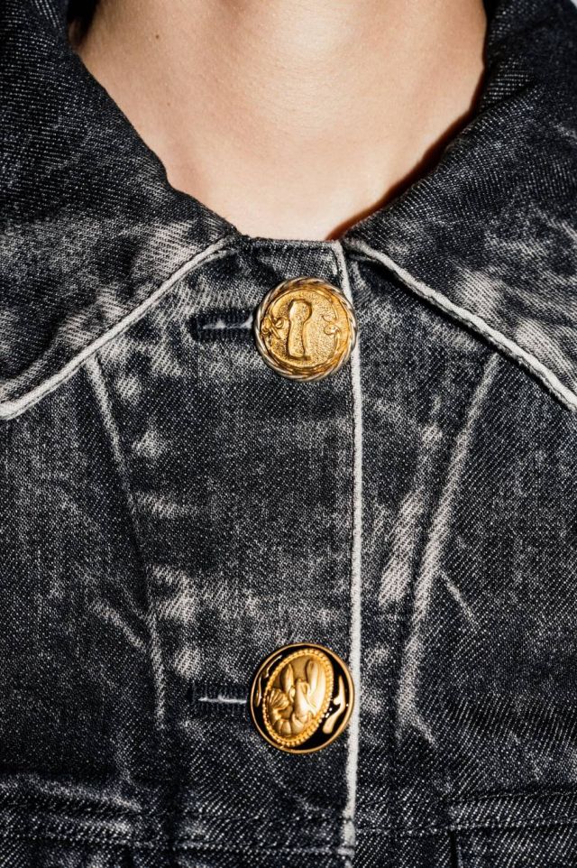 مُزيناً بأزرارٍ ذهبية، وخياطةٍ على الطراز الغربي، ورموزٍ سريالية، يصبح هذا الدنيم درعاً وزينةً في آنٍ واحد.