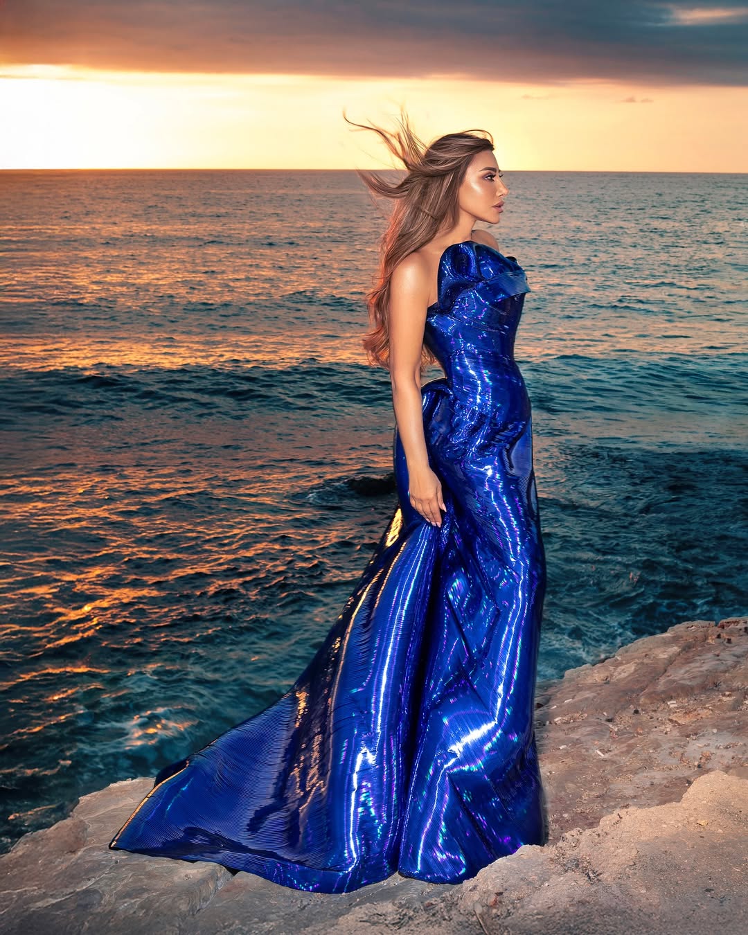 واختارت النجمة اللبنانية فستاناً ميتاليكياً باللون الأزرق الملكة، وبدت فيه كشخصية من القصص الأسطورية القديمة، بقصة هندسية بارزة وغير متساوية عند منطقة الصدر، وجاء التصميم ضيق من الأعلى ومن دون أكمام، لينسدل ويتسع من الأسفل على شكل تنورة واسعة مع ذيل طويل من الخلف، في تصميم أنيق ومختلف.