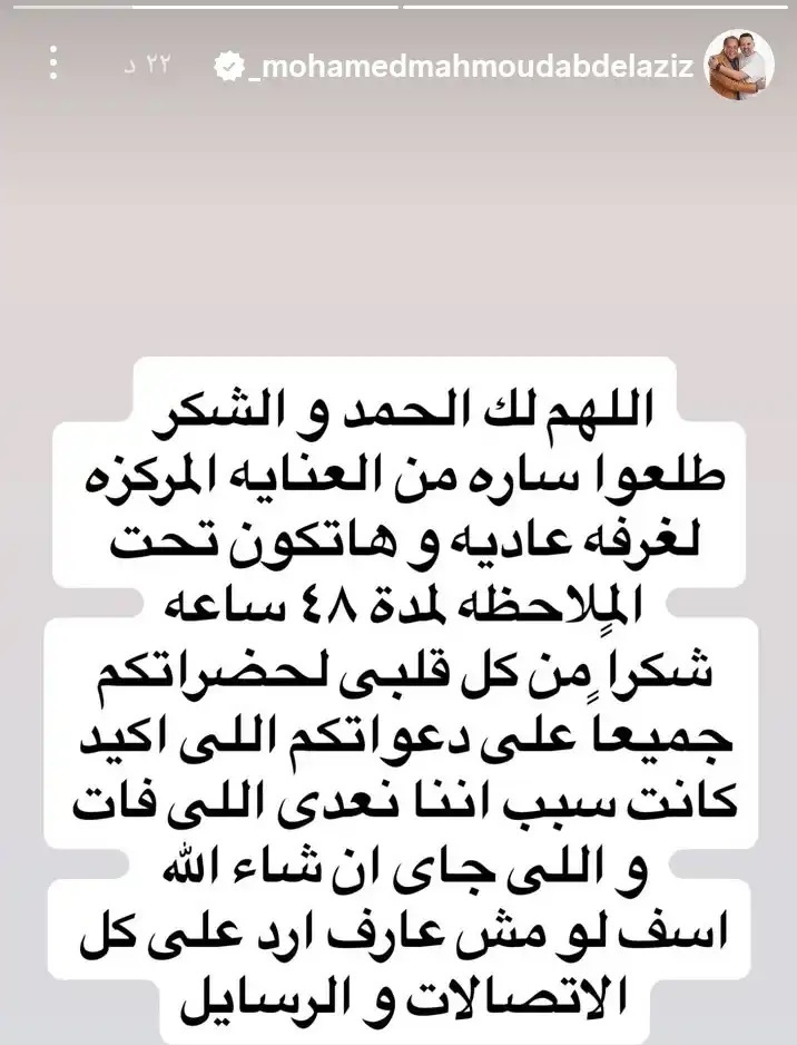 وعاد محمد محمود عبد العزيز لينشر منشوراً آخر كشف فيه عن تطورات الحالة الصحية لزوجته، وطمأن خلاله متابعيه قائلاً: "اللهم لك الحمد والشكر، طلعوا سارة من العناية المركزة لغرفة عادية، وهتكون تحت الملاحظة لمدة 48 ساعة".