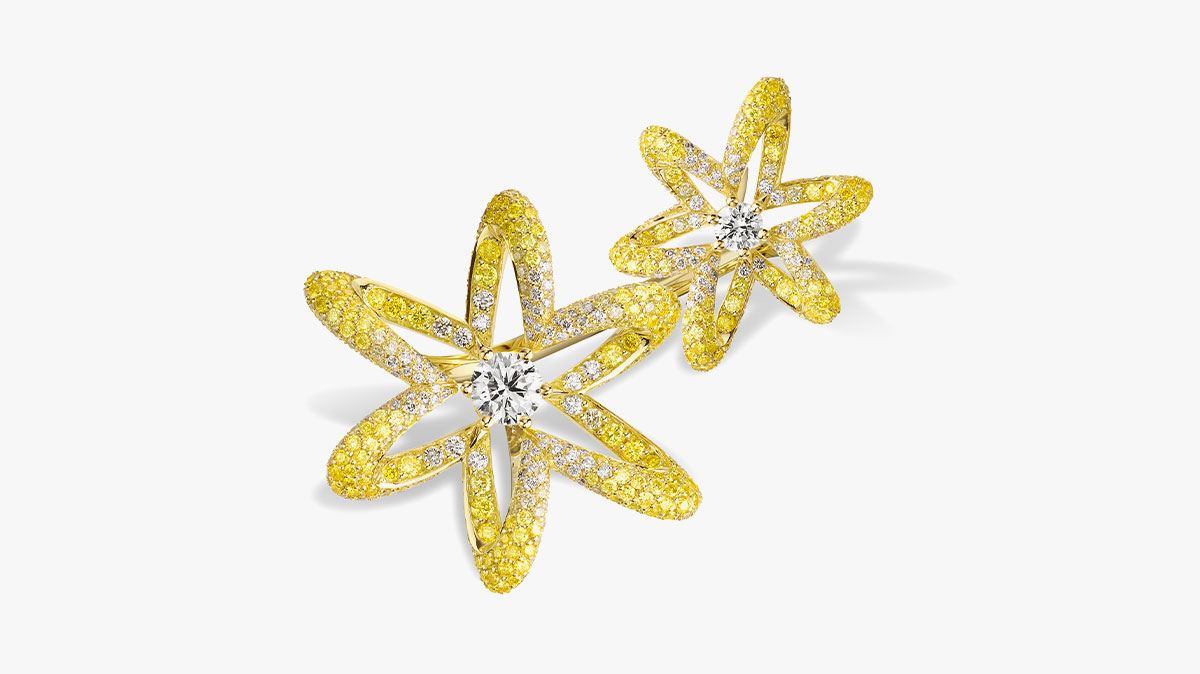 ويكتمل الطقم بأقراط على شكل نجمة من الذهب الأصفر أيضاً عيار 18 قيراطاً، وتأتي مرصّعة بقطع ألماس صفراء (5.17 قراريط) وبيضاء (2.18 قيراط)، في تصميم أنيق يناسب كل الإطلالات والمناسبات، ويعتبر هذا التصميم من الأجمل في عام 2025.