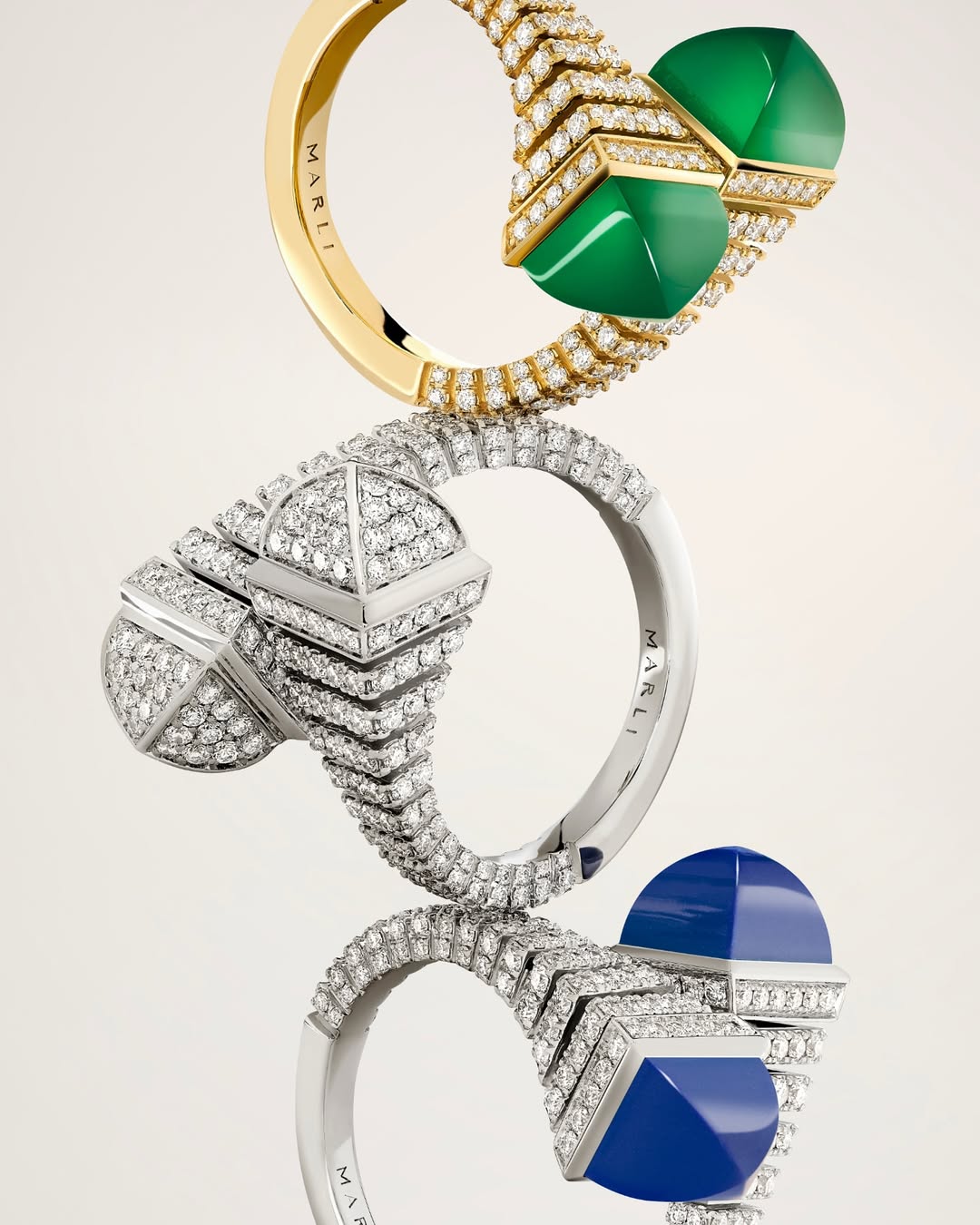 من أهم دور المجوهرات التي أبدعت في هذا الاتجاه، تبرز مارلي نيويورك (Marli New York) بتصاميمها العصرية التي تجمع بين البساطة والترف. فقد أتقنت الدار تقديم الخواتم الكبيرة بأسلوب يوازن بين القوة والأنوثة، مع لمسات من الذهب والألماس والأحجار الراقية التي تعكس هوية المرأة العصرية الأنيقة.