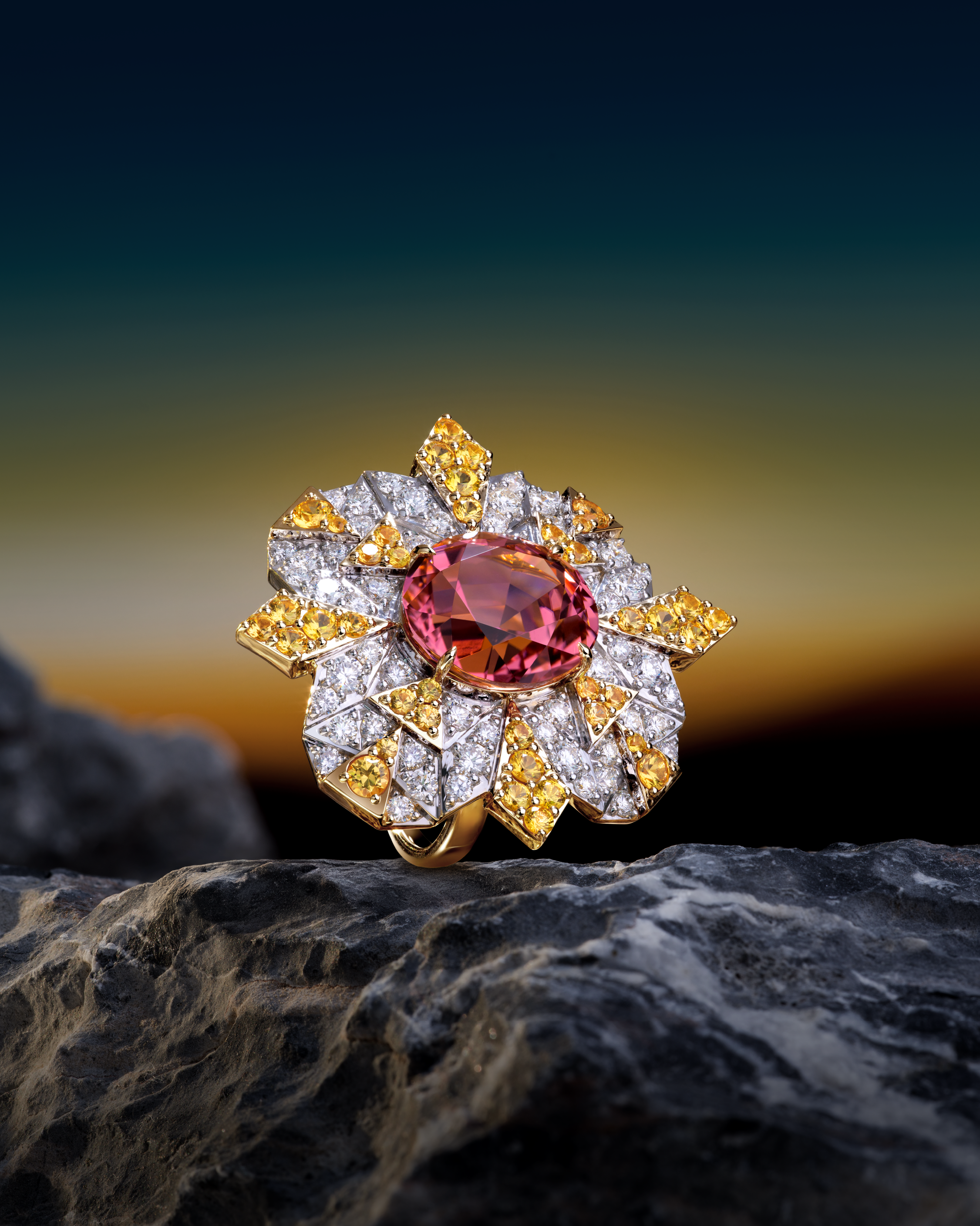 • طقم إرث الضوء Legacy of Light Suite – تورمالين زهري وصفير أصفر يعكسان أولى لحظات الفجر، تعبيرًا عن التجدد والأمل