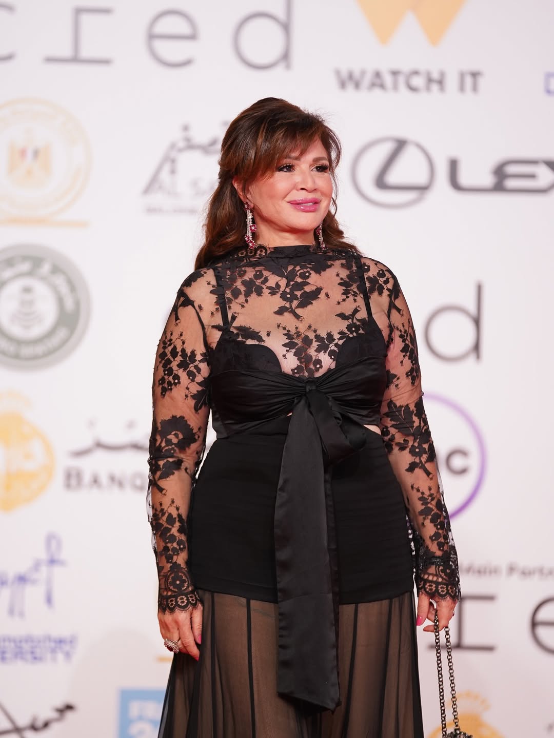 اختارت إلهام شاهين فستاناً من الدانتيل الأسود المطرّز بنقوشٍ زهرية رقيقة. التصميم الانسيابي مع ربطة حريرية عند الخصر أضفى نعومةً على الإطلالة، بينما أضاف المكياج الوردي وتسريحة الشعر المنسدل لمسة دفءٍ ورقي.